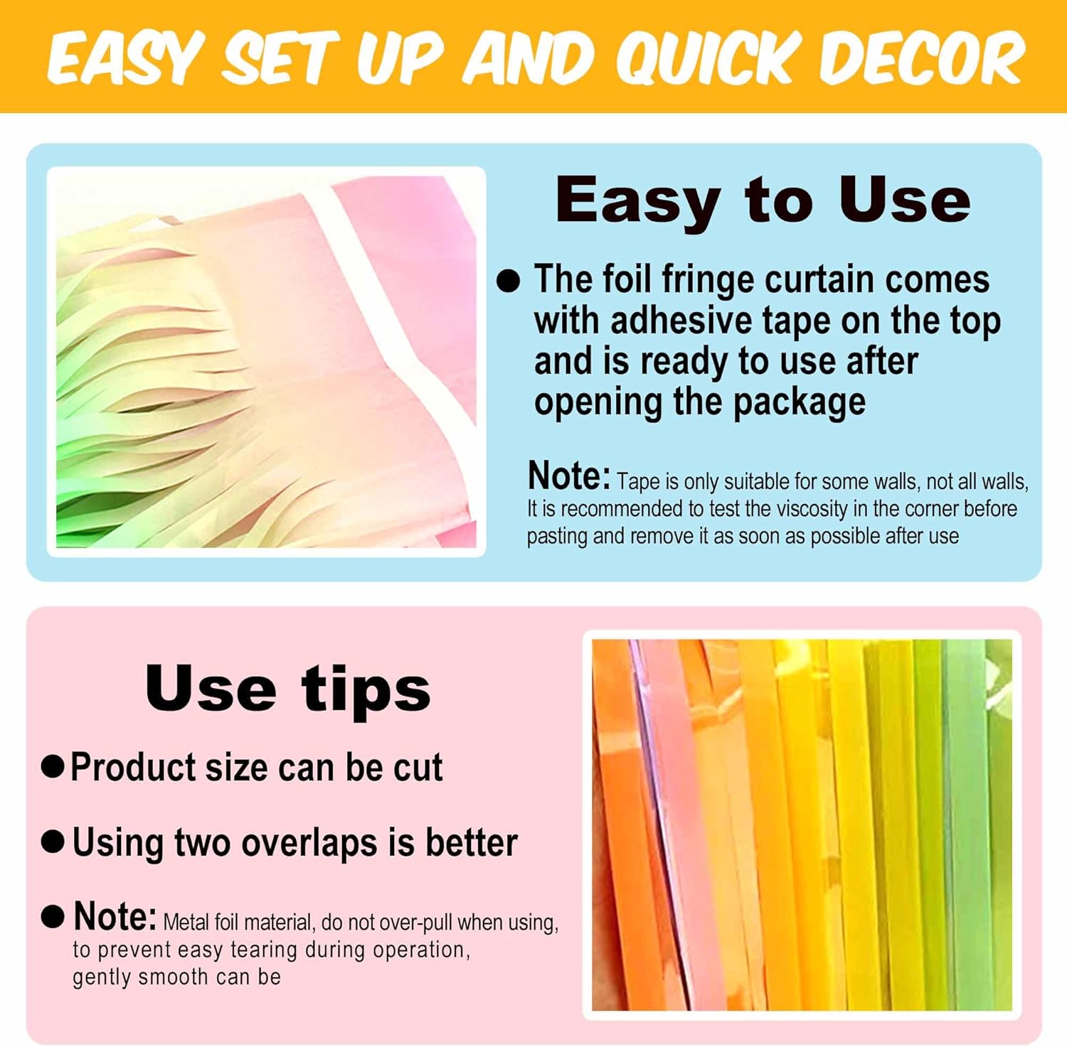 - Easy to Use: The tinsel foil fringe streamers curtain backdrop comes with double sided tape on the top, gently peel plastic strip off and it would be very easy to paste on smooth surfaces such as wall, window, table, door or anywhere you like