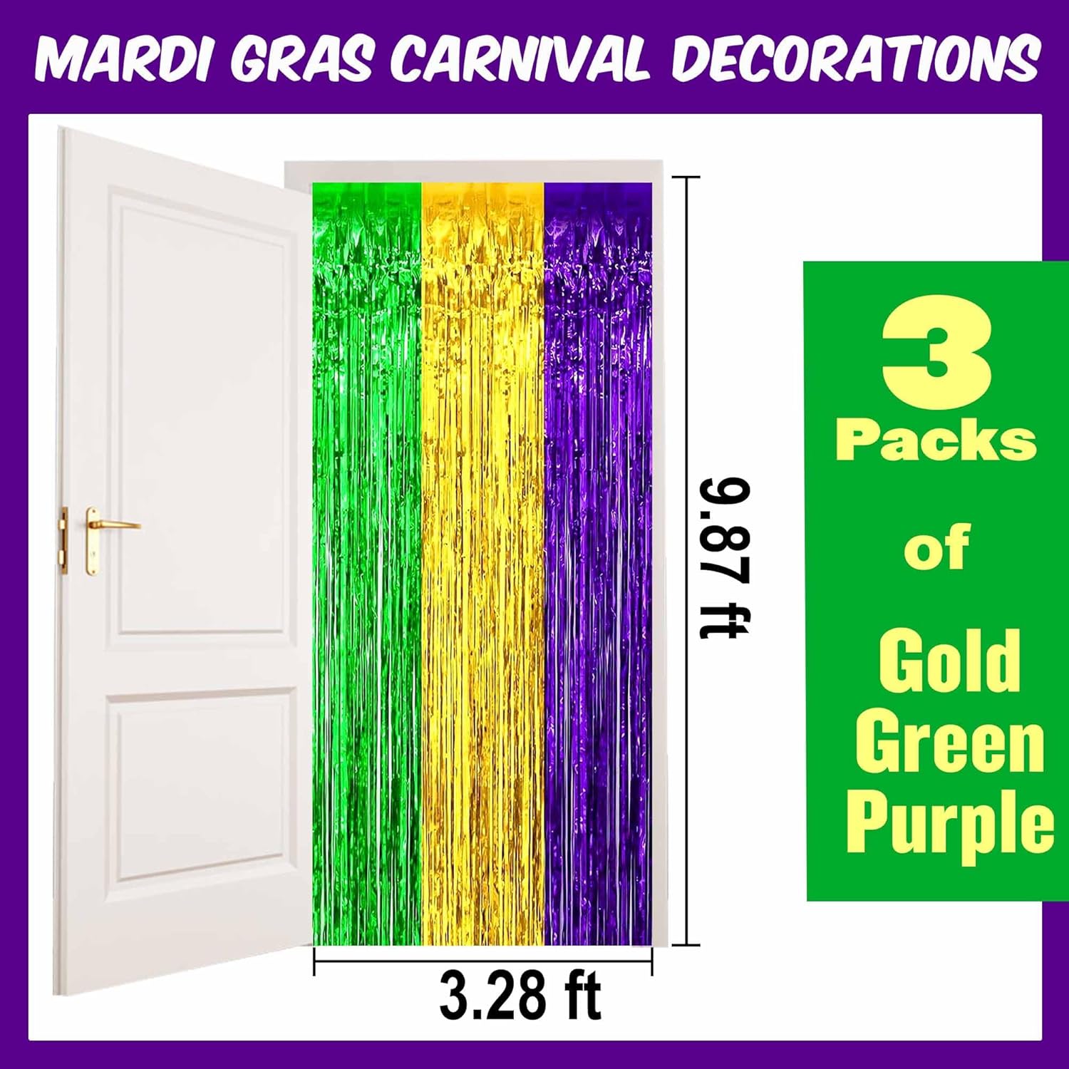 3 Pack Gold Green Purple Foil Fringe Curtains Backdrop, 3.28 x 9.8 Ft Metallic Streamers Tinsel Curtains Background for Photo Booth, Birthday, Halloween, Christmas, New Year Party Decorations