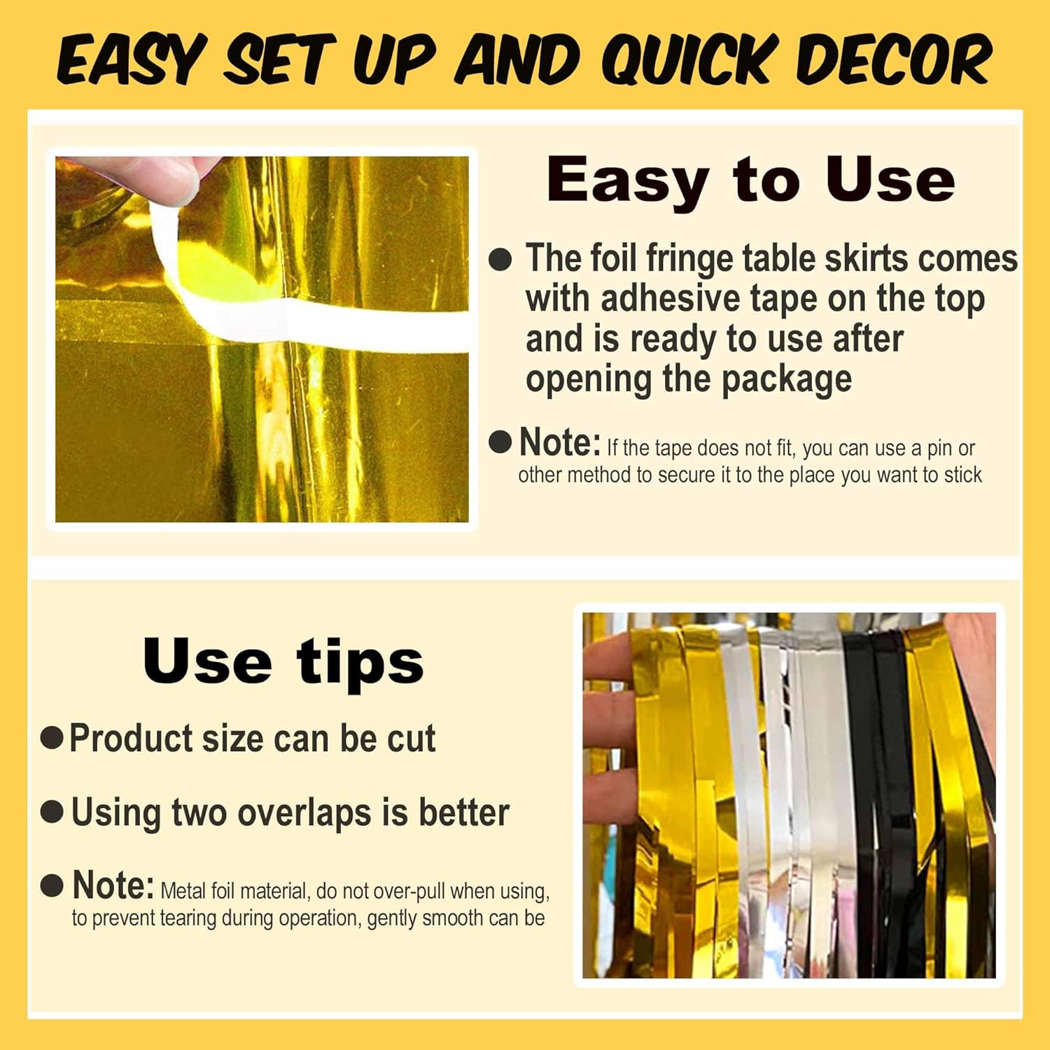 - Use Tips: You can cut the foil fringe table skirts streamers with scissors into the suitable Length, assemble the party streamers side by side to make the backdrop larger. If you want to make your foil fringe table skirts look fuller and thicker, you can overlap two table skirts, also overlap table skirts in different colors to create a beautiful party easily