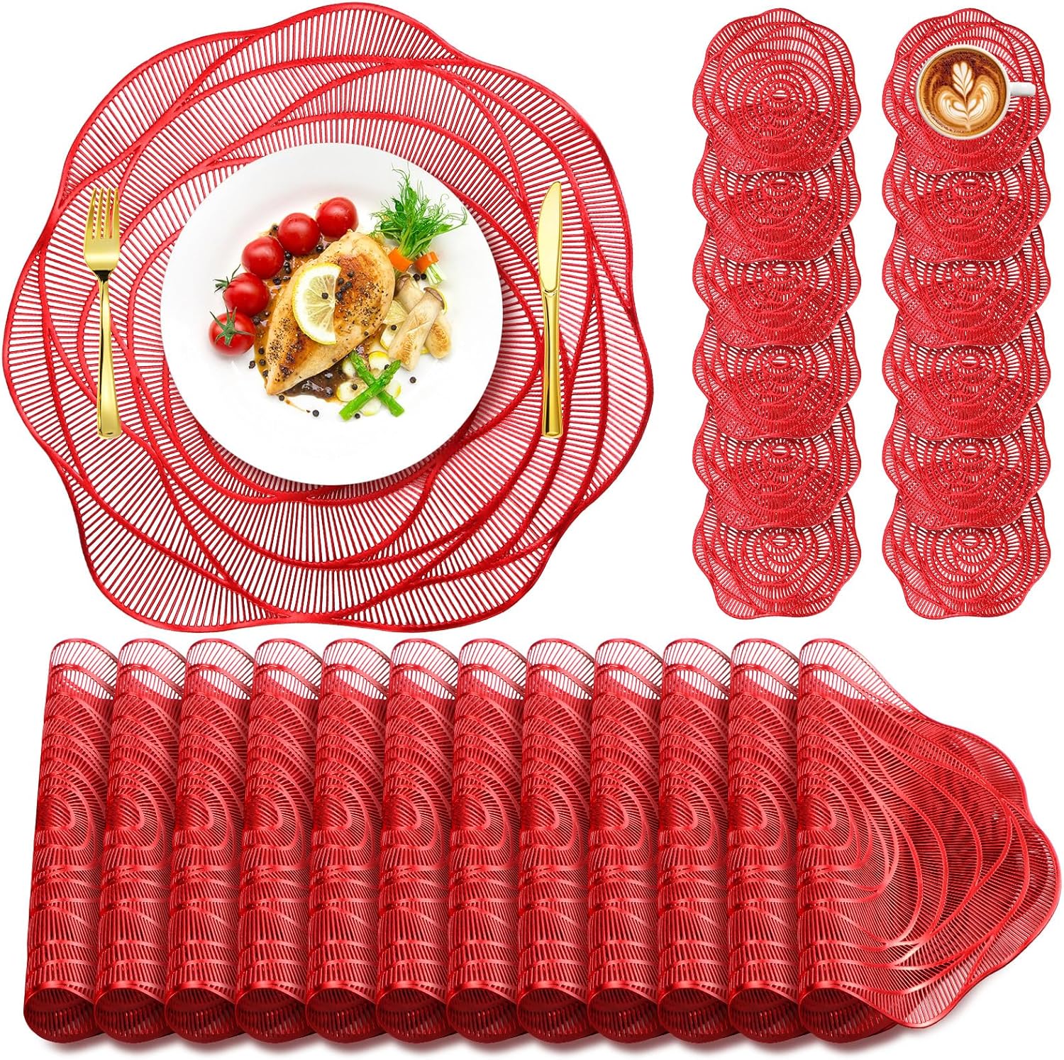 Sieral 12 Set 15 Inch Round Pressed Vinyl Placemats Hollow Out Rose Placemat Set Metallic Slip Resistant Place Mat Coaster Including Place Mats and Coasters for Wedding Dining Kitchen (Red)