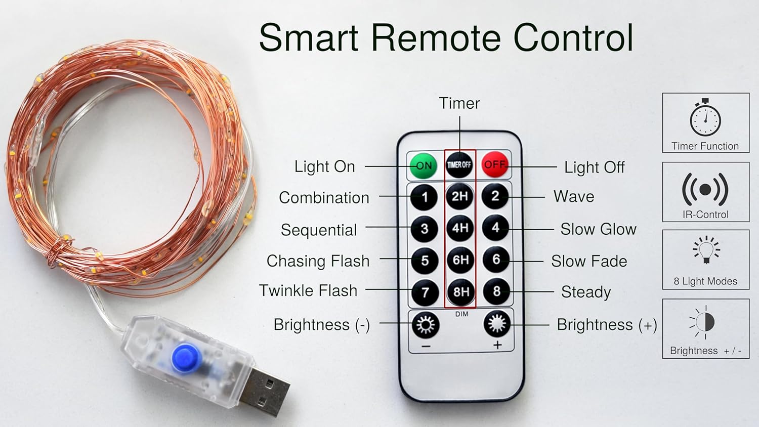 - Set the perfect mood with USB-powered lights: From a romantic twinkle to a steady warm white glow or a festive flash, cycle through eight lighting modes using the remote control. Adjust brightness and set timers to create a dreamy atmosphere for any occasion, all with the convenience of USB power. Perfect for indoor and outdoor use (please keep USB connector dry).