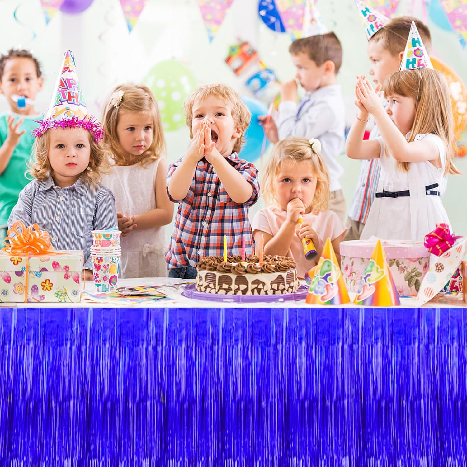 4 Pack Metallic Foil Fringe Tinsel Table Skirts,29x108 Inch Party Disposable Table Skirt Banner for Hotel Banquet Parade Floats Mardi Gras Holiday Birthday Wedding New Year Party Decoration(Blue)