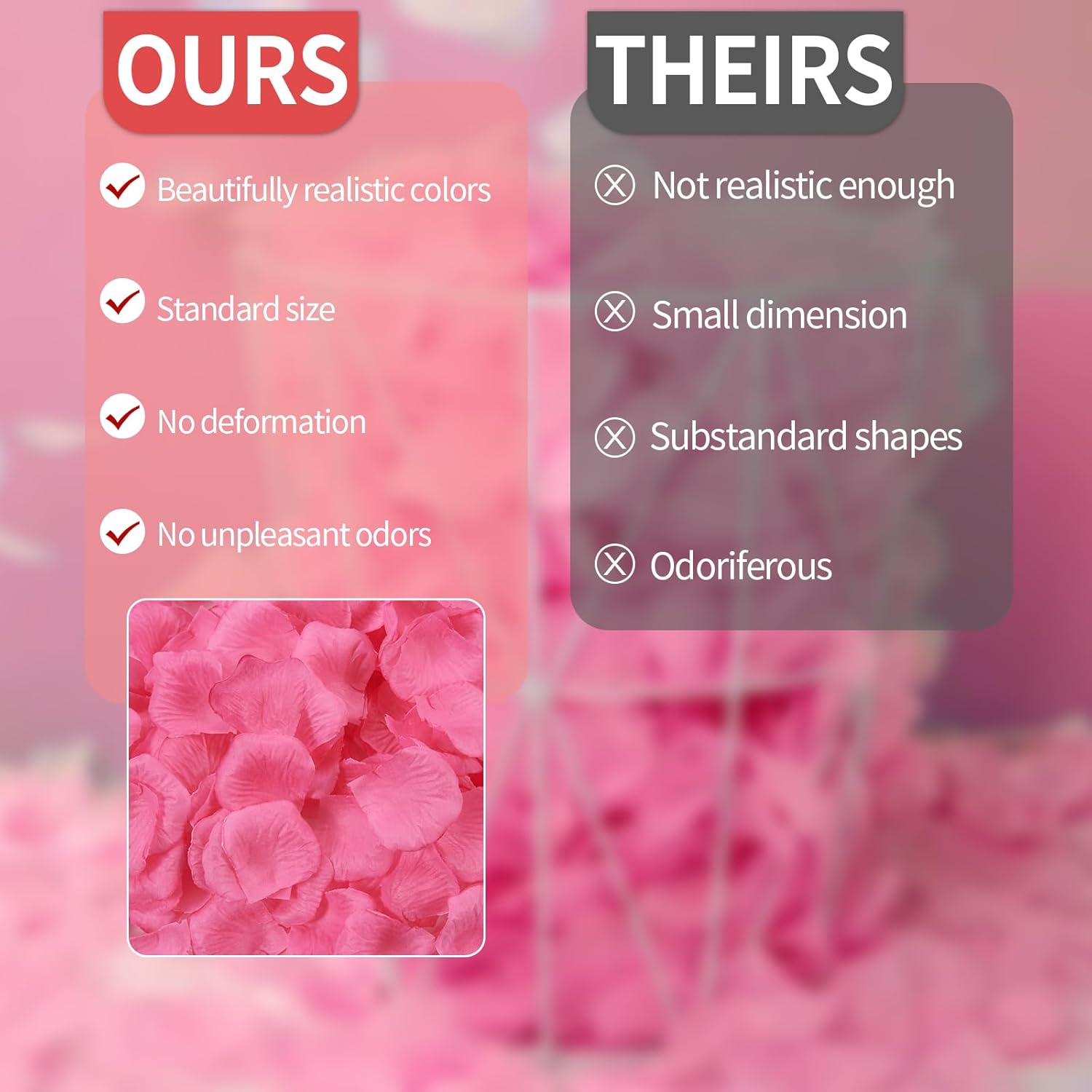 - 💖【High-Quality Material】💖Crafted from high-quality non-woven fabric, each petal has a realistic appearance and touch. These artificial rose petals are durable compared to real petals, and you can collect them after use for repeated use. The petal size is 1.9 * 1.9 inches, and spreading them evenly will create a floral sea perfect for two. Consider purchasing more for large events like weddings and parties.