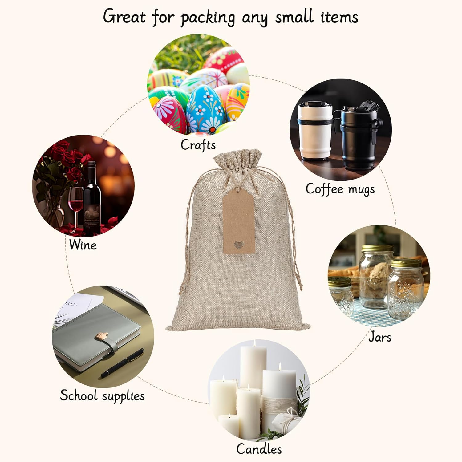 Tapleap Burlap Gift Bags with Drawstring - 10Pcs 8x12 Original Sacks with String and Tags for Wrapping Halloween Favors, Clothes, Toiletries, Breads, Mason Jars, For Birthday, Wedding