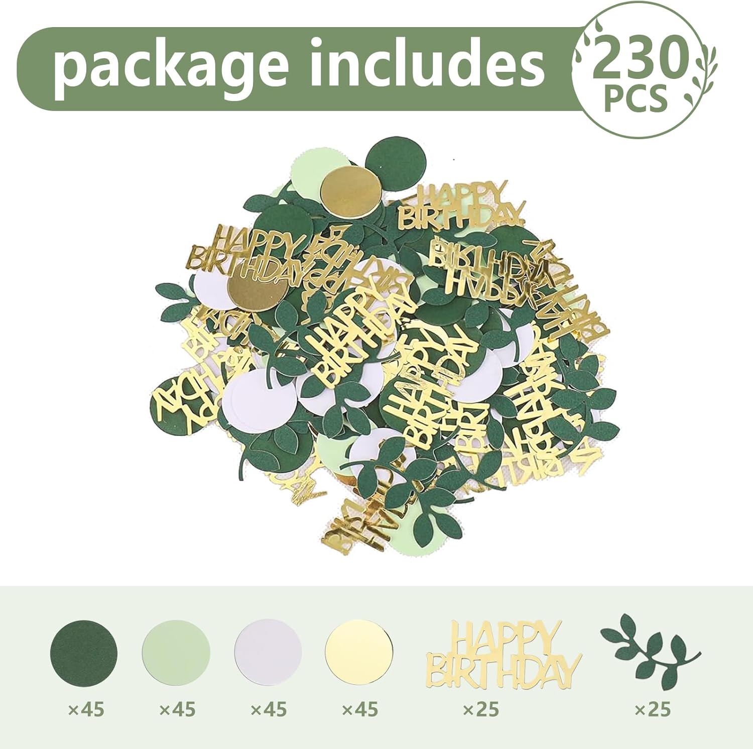 - 【YOU WILL GET】You will receive Sage Green Gold Happy Birthday Confetti 230 pieces in 4 different colors (sage green, gold, white, dark green) green eucalyptus leaves and gold happy birthday, which can meet your various decoration needs.