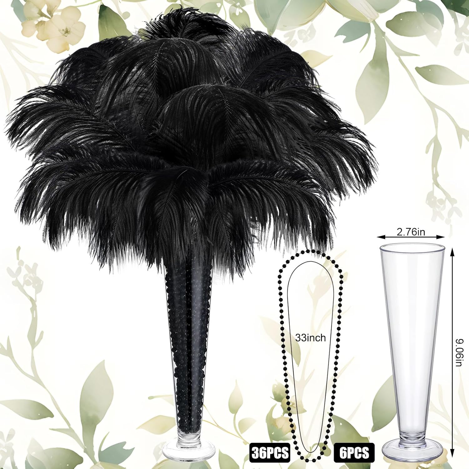 - Wedding Table Decoration Set: you will receive 54 black ostrich feathers for vases, 54 plastic hose sticks, 6 plastic vases, 9 rolls of black tape, 36 black beaded necklaces in bulk; Sufficient quantity for rich combinations, easily meet your wedding party, home decoration needs and DIY craft needs; You can also share it with your friends and family