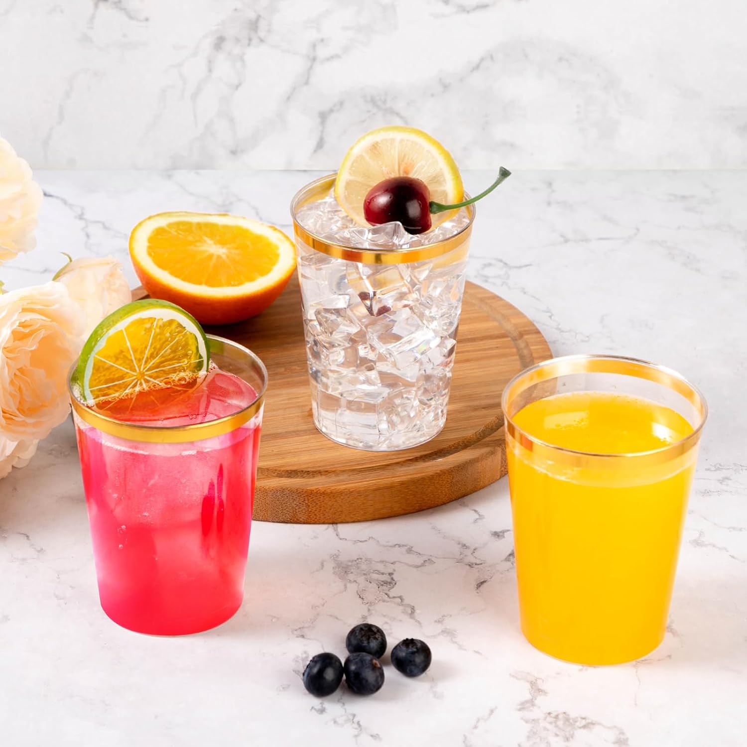 Goodluck 100PCS 10oz Gold Plastic Cups for Party, Disposable Gold Rim Cups, Plastic Cocktail Glasses for Wedding Thanksgiving, Christmas, and Parties