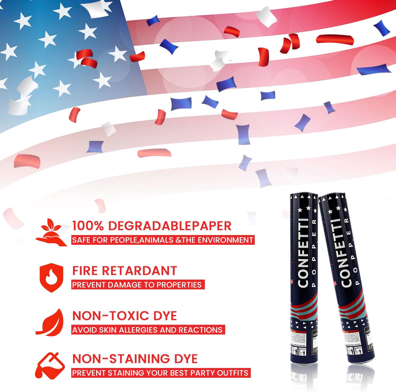 - 【Biodegradable Party Poppers】Committed to the environment, our confetti poppers are filled with biodegradable confetti. Enjoy the spectacular sight of confetti raining down, knowing it's eco-friendly. Ideal for outdoor and indoor celebrations, these poppers provide a guilt-free way to add excitement to your patriotic parties, graduations, and surprise events.