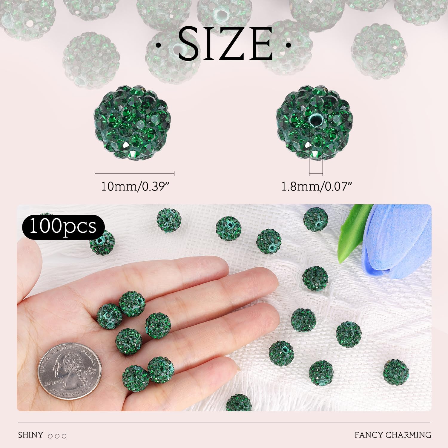 100 pcs 10mm Rhinestone Beads for Jewelry Making, Dark Green Shiny Round Shamballa Disco Beads Bulk, Sparkle Crystal Clay Christmas for Bracelet Baseball Necklace Earring Crafting and DIY
