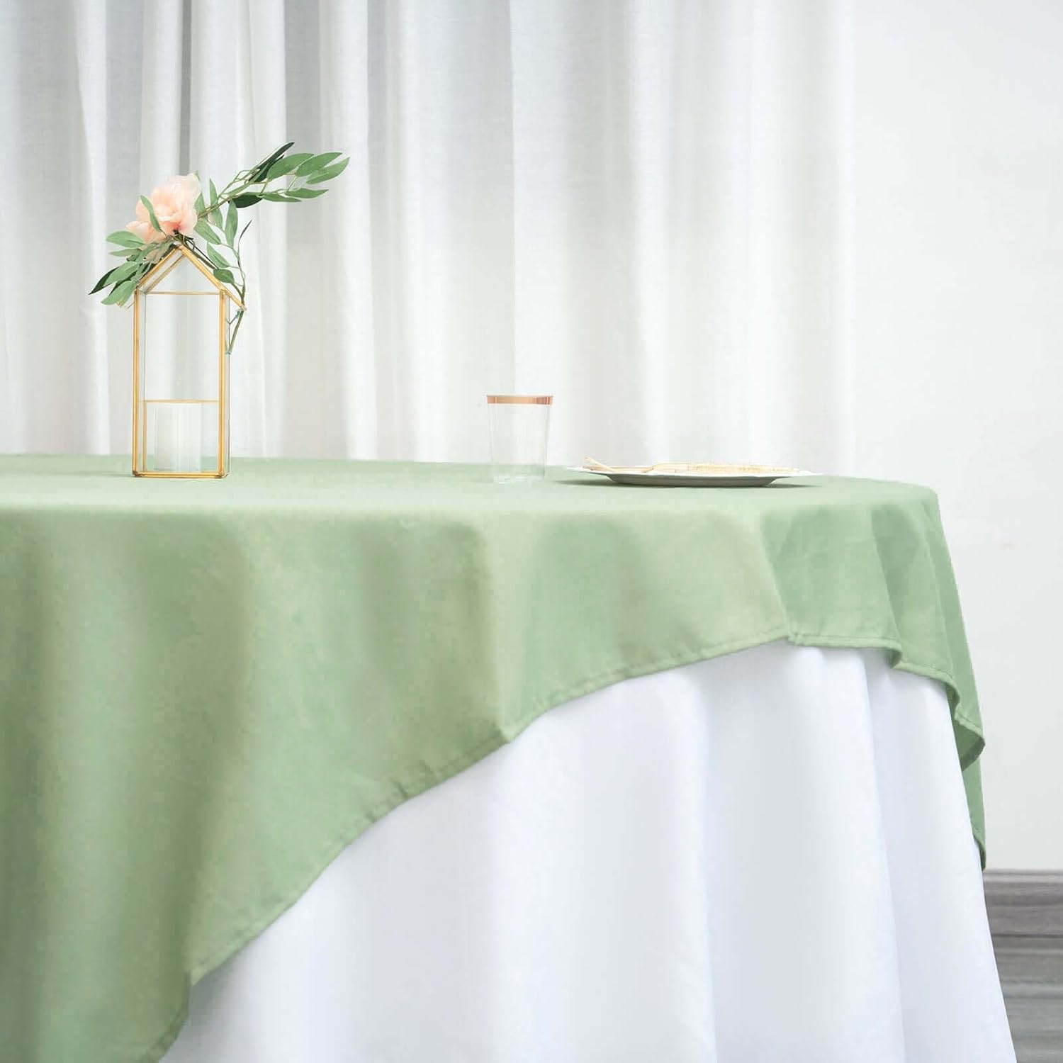 - Quantity: 1 Square Tablecloth Material: 100% Polyester Color: Sage Green Size: 70" x 70" High Quality: 200 GSM Stain & wrinkle resistant, machine washable 1 piece, seamless design Hemmed edges for an exquisite look. All sizes are approximate measurements Due to different light settings the actual color might vary a bit from the pictures.