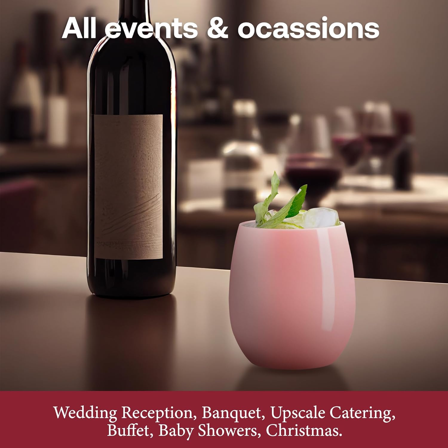 - STYLISH & CHIC DESIGN: Elevate events effortlessly using this elegant solid pink stemless wine glass set, bringing upscale aesthetics and trendy disposable drinkware to celebrations.