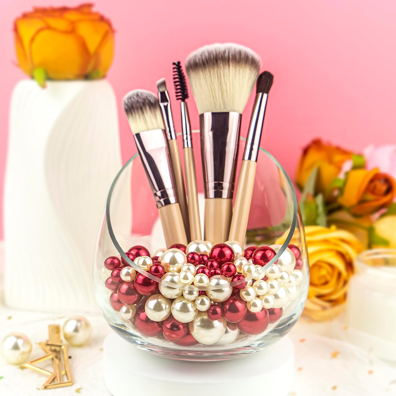 300Pcs Cream&Red Polished No Hole Faux Pearl Beads for Vase Filling Decorations, Plastic Pearls Vase Fillers, Table Scatters, Wedding Centerpiece, Home Decor, 8/14/20 mm