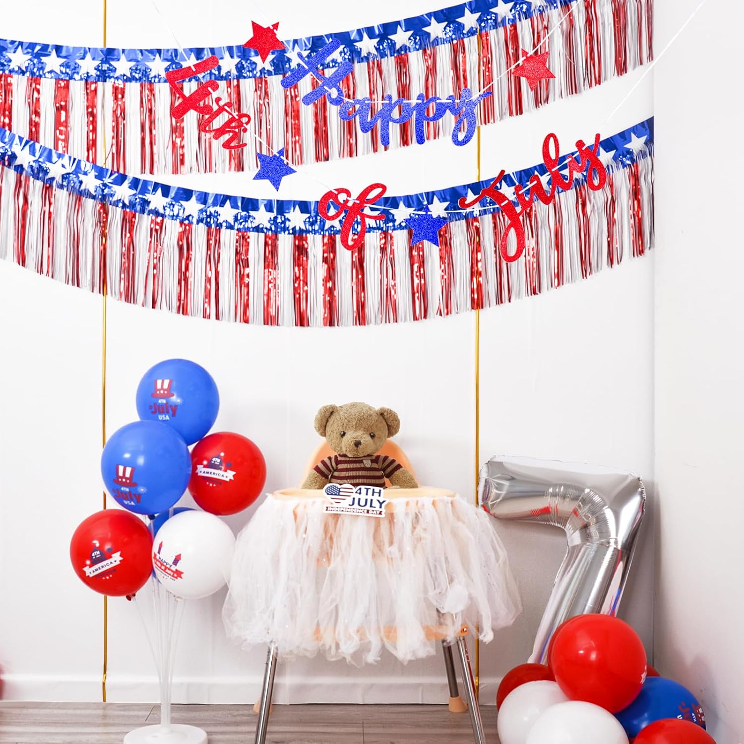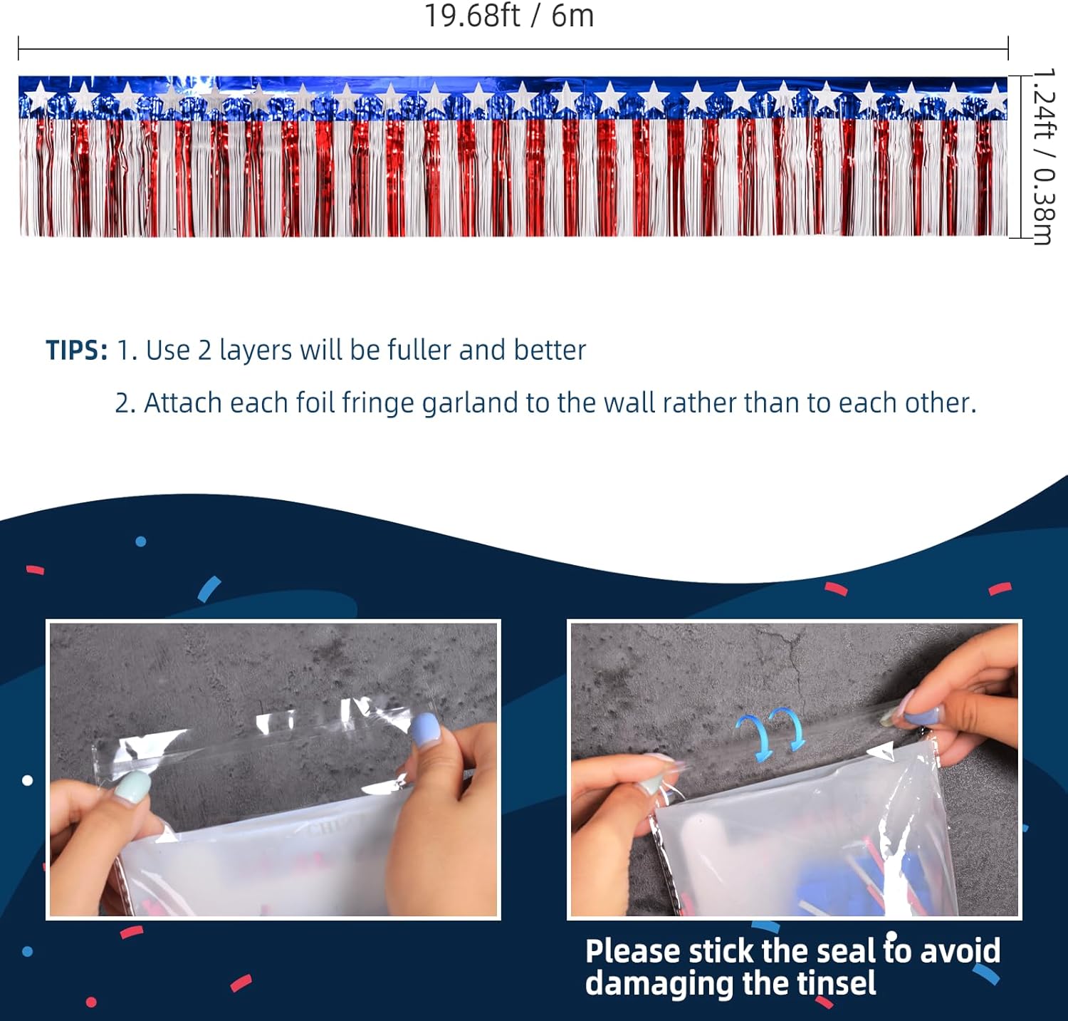 - π½ PACKAGE INCLUDES: 2 Packs red white and blue star foil fringe garland / metallic tassel banner, each garland is 1.24 feet wide * 19.68 feet long, perfect 4th of July decorations.