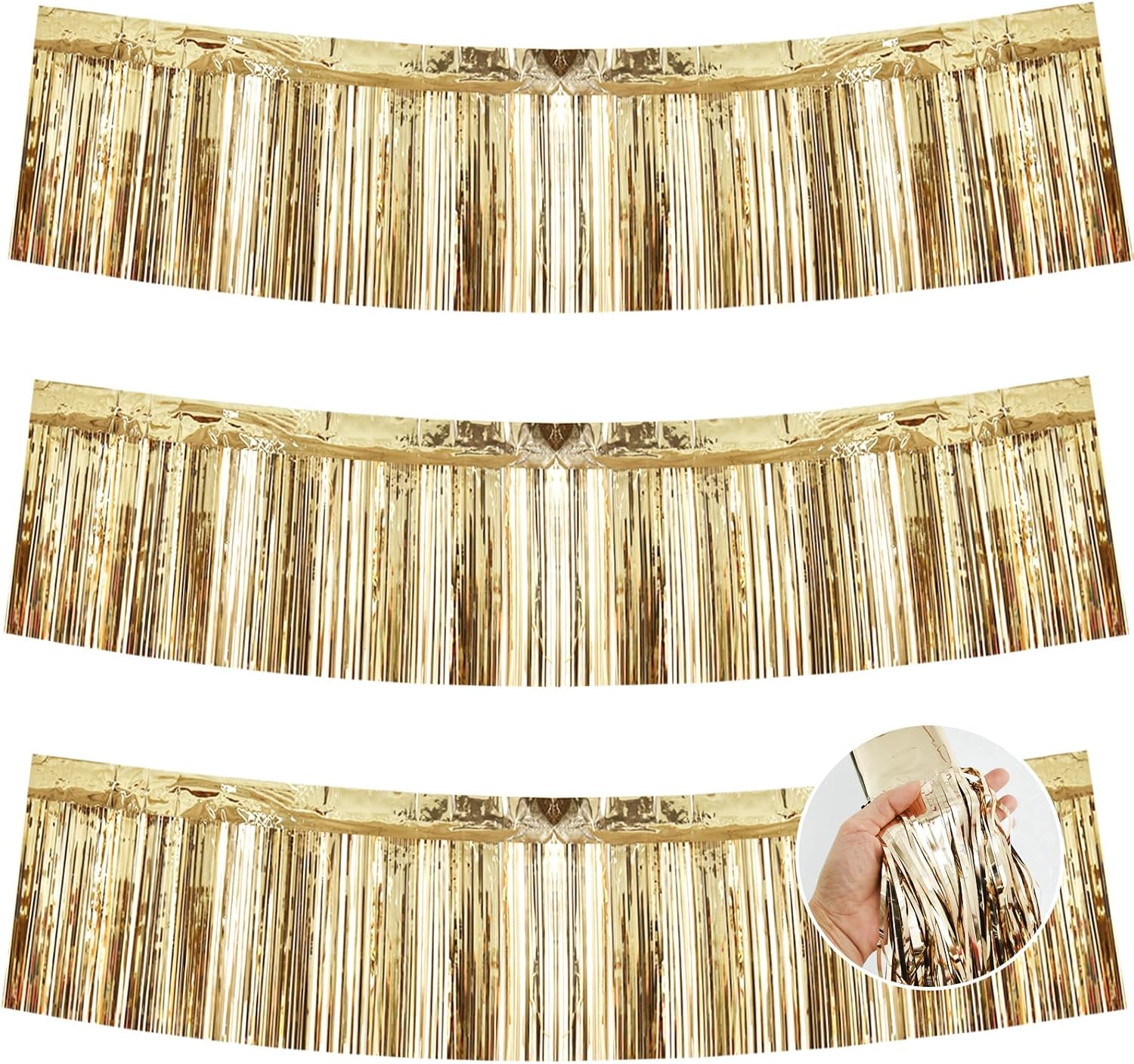 BEISHIDA 3 Packs Metallic Foil Fringe Garland Champagne Wall Hanging Tinsel Fringe Banners for Car Floats Halloween Bridal Shower Wedding Birthday Easter Graduation Holiday Party Decoration(30Ft)
