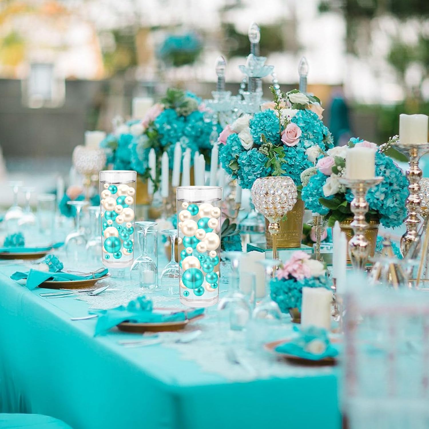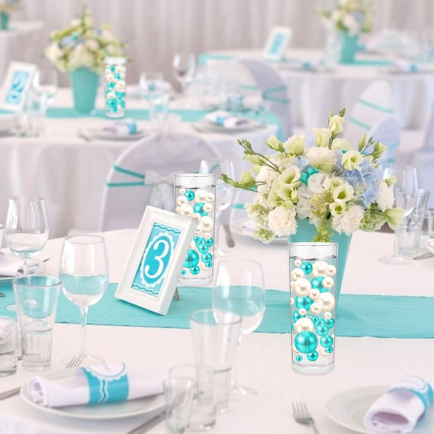 100PCS Teal White Faux Pearls Beads for Centerpiece Vases, Vase Filler Faux Pearls, No Holes Filler Beads for Party Anniversary Birthday Wedding Table Decor, 14/20/30mm