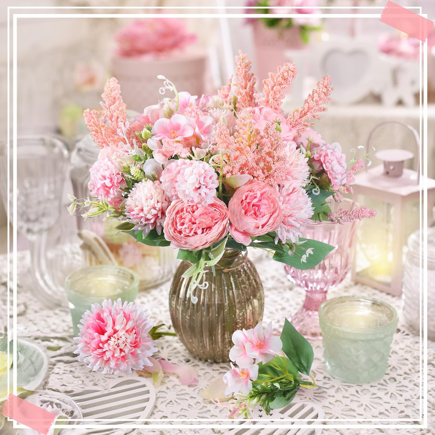 - Vibrant Splashes of Pink: this package includes 8 bouquets of pink silk flowers in 7 heads, offering a stunning array of vibrant pink shades to your decor; Each bouquet containing 7 prongs of 7 flowers, including 2 large peonies, 2 large ball chrysanthemums, 2 medium ball chrysanthemums, 1 large hydrangea, 3 foam fruit in the middle