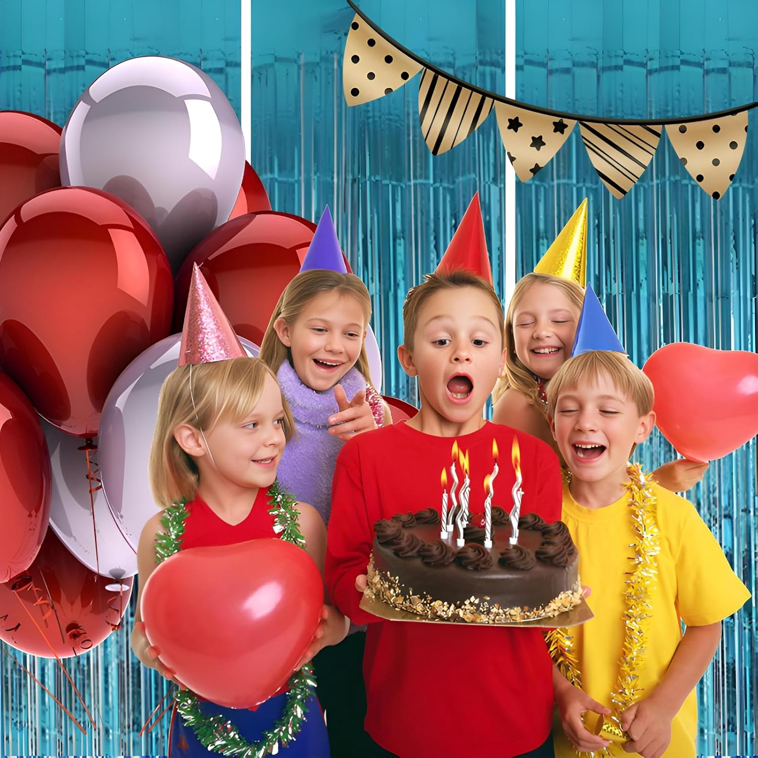 - Pair with other party decorations: Tinsel backdrop curtain can be paired with LED lights, balloons, banners, wreath, garlands, swirl streamer, tissue paper pom poms.