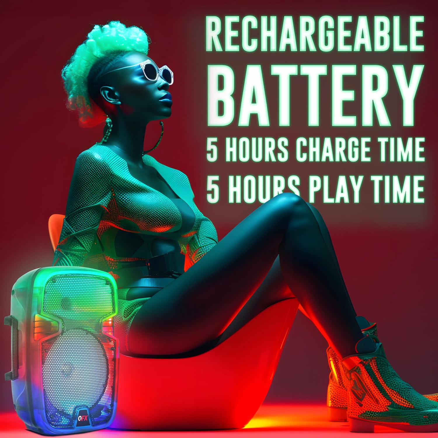 - ENDLESS ENCORES - With up to 5 hours of playtime and a 5-hour recharge time, the high-capacity rechargeable battery ensures the TMS-853 8-inch speaker keeps the party alive until the sun comes up. Illuminate your space with sound and enjoy the convenience of included accessories like a remote control and an AC-DC power adapter. ADD TO CART now.