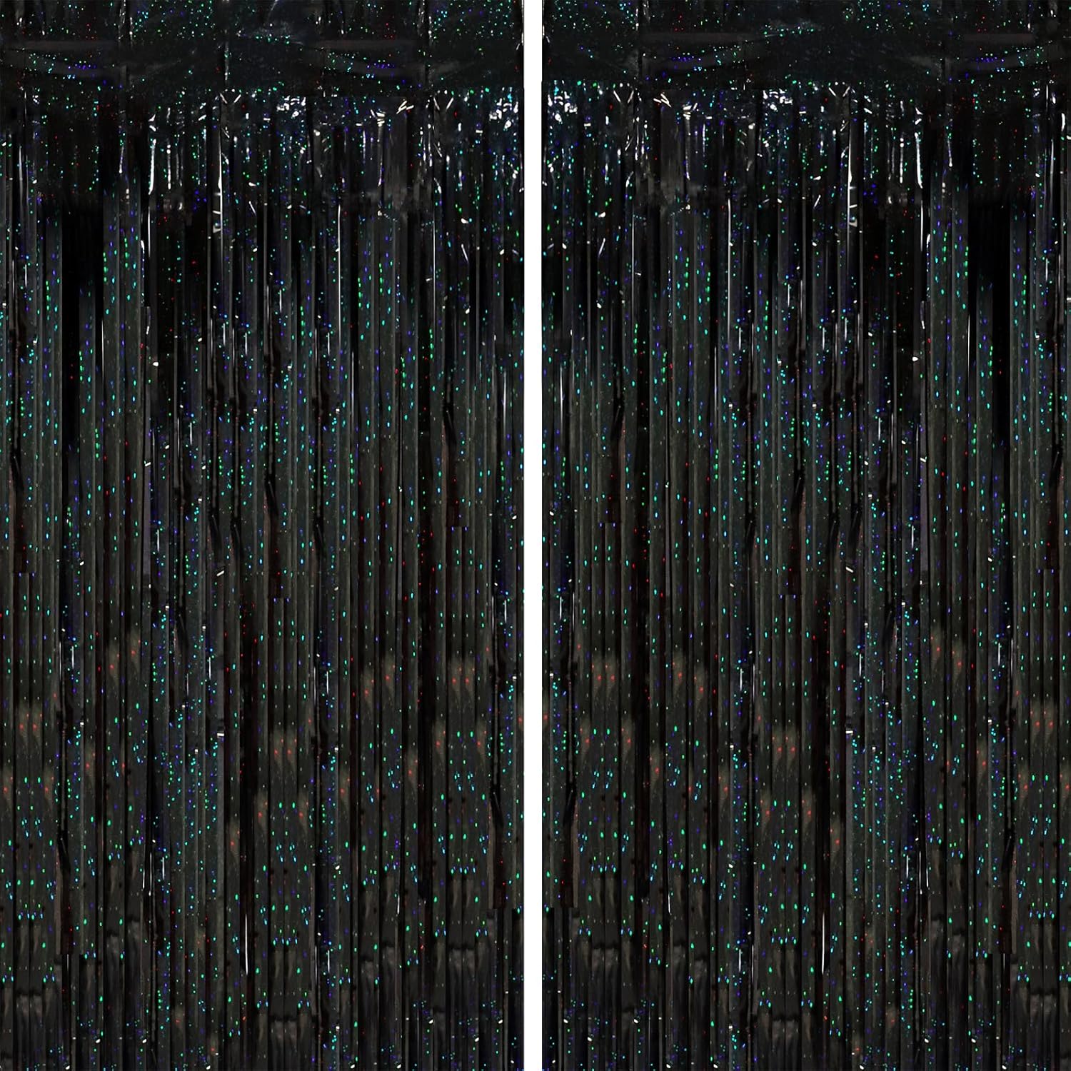 2 Pack Laser Black Tinsel Foil Fringe Curtains, Black Party Decorations, Metallic Tinsel Party Streamers Backdrop for Birthday Halloween Masquerade New Years Gatsby 1920s Party Decorations