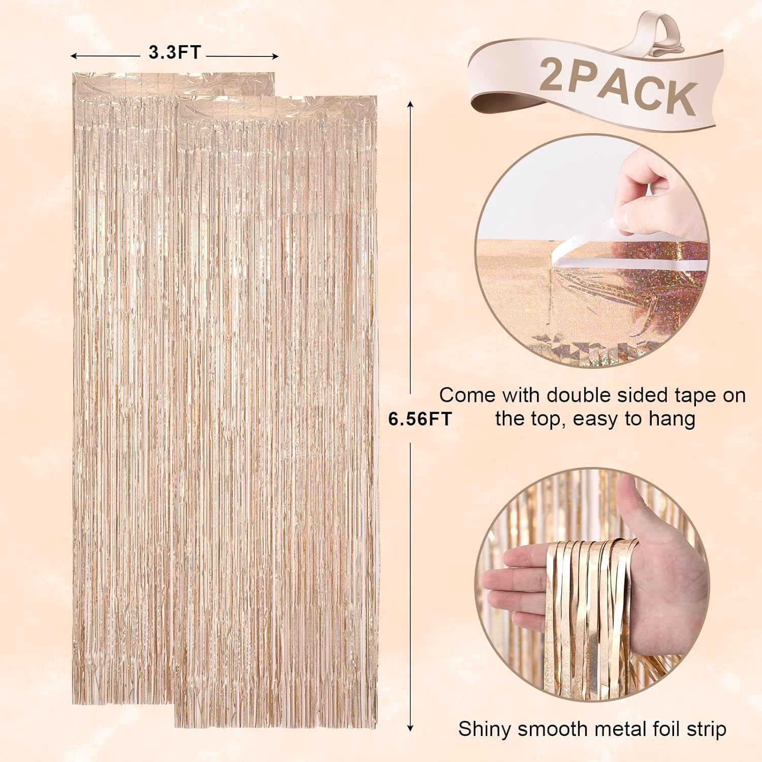 - Stunning Decorative Set: You'll receive 2 pcs champagne gold foil fringe backdrop curtains, each measuring 3.28 ft (wide)Γ6.56 ft (drop). Enough length foil fringe curtains backdrops are perfect for the door or wall to create an impressive decoration