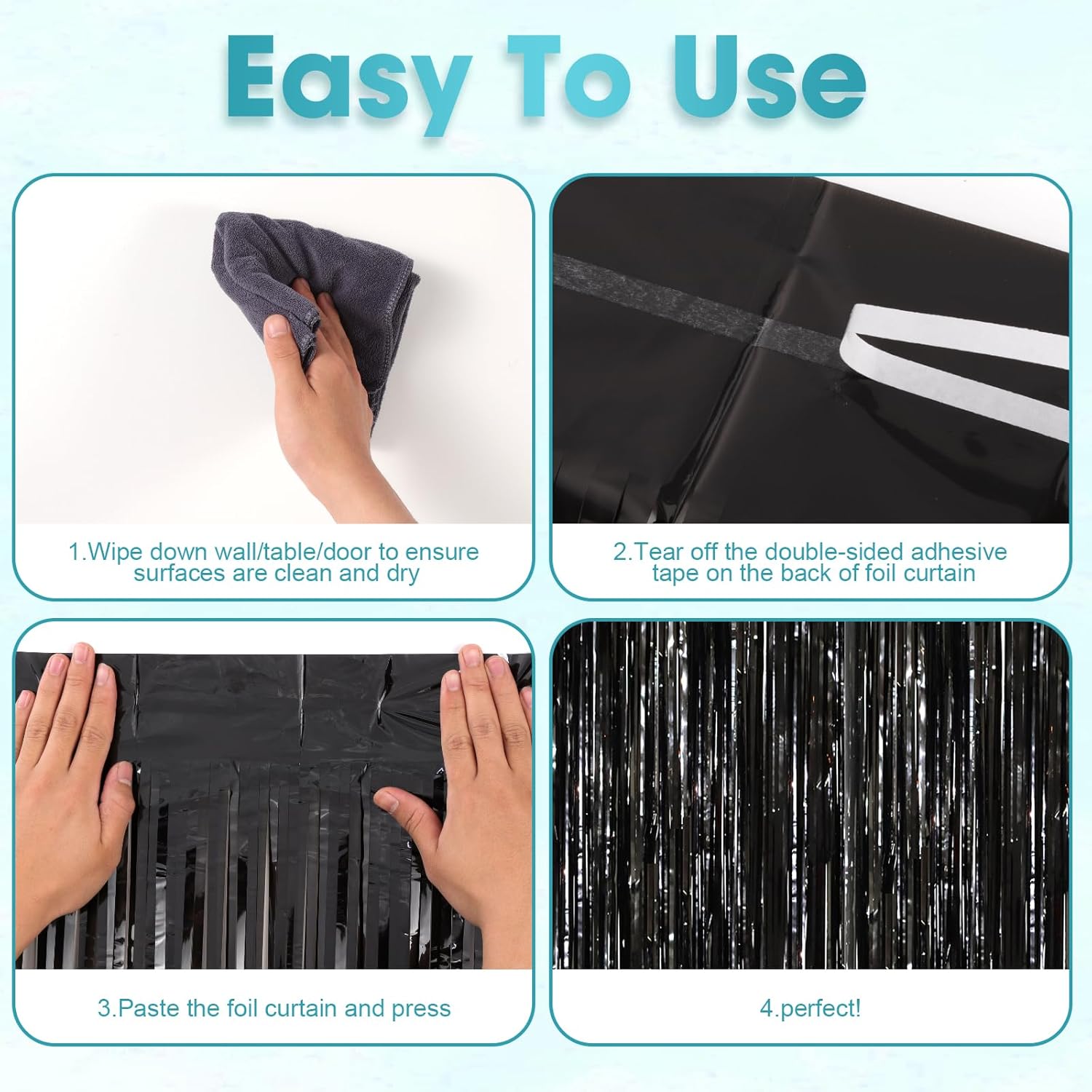 - How to Set up: Wipe down wall/table/door, ensure surfaces are clean and dry, tear off the double-sided adhesive tape, paste the foil backdrop curtains and press. Hang each individual tinsel fringe curtains in different locations for a fuller effect