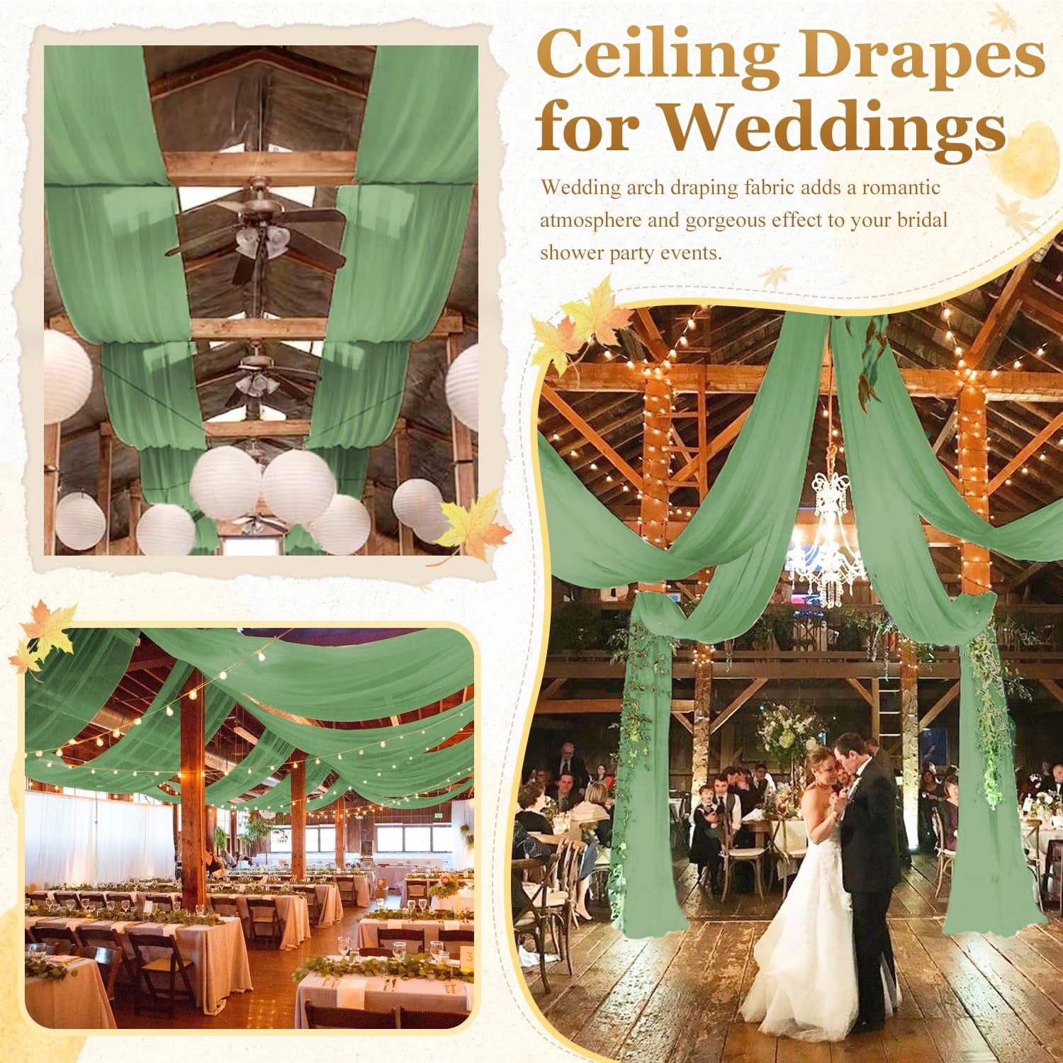- âSize & Color - Ceiling Drapes: Our sage green ceiling drapery contains 4 panels. Each panel is 5FT width x20FT length. Wedding arch drapes is long enough creating a great eye catching detail in wedding party events decor.