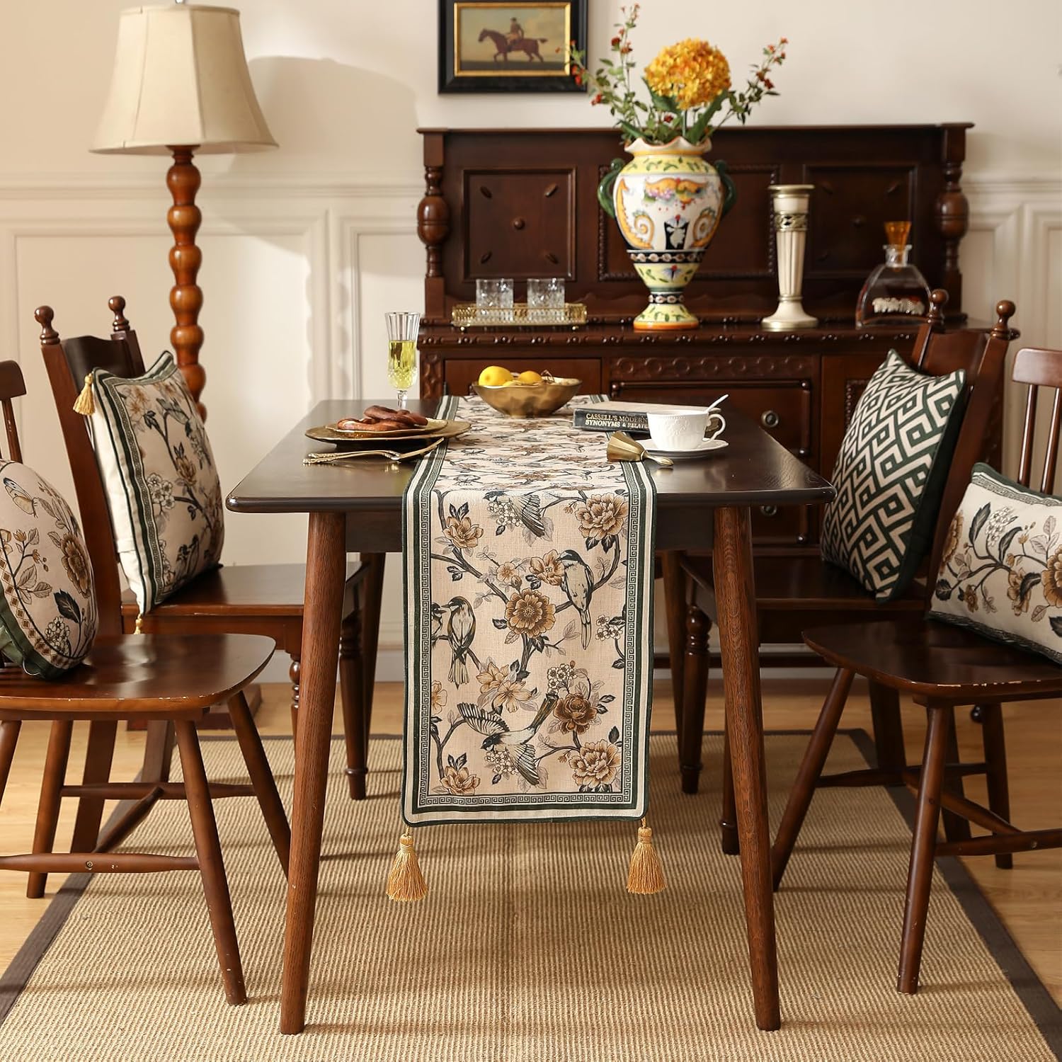 ISAENNE Designer Vintage Beige Linen Table Runner 71 Inches Long,Elegant Floral and Bird Pattern Decor Table Runners for Dining Tables,Thanksgiving,Christmas,Banquet,Party,12"*71"-Murad A