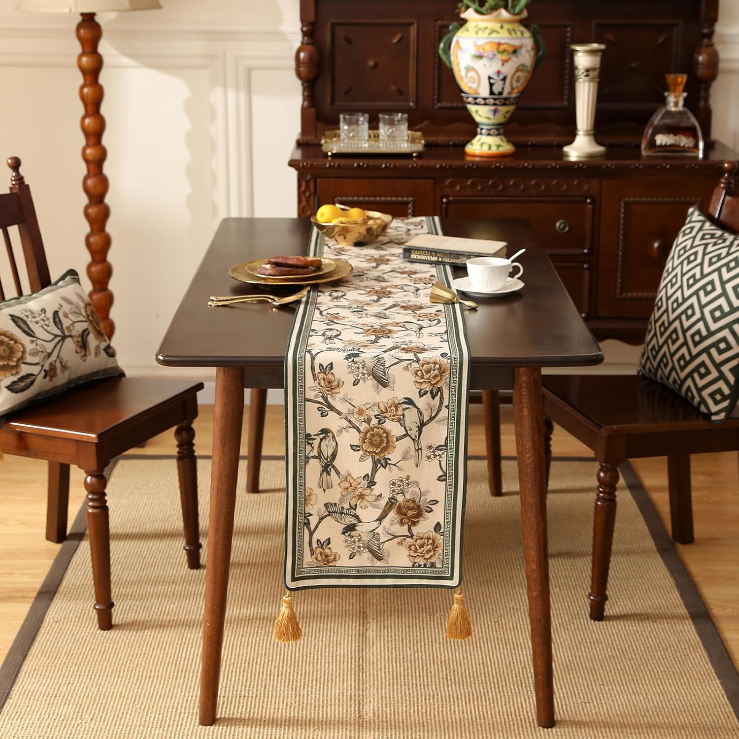 ISAENNE Designer Vintage Beige Linen Table Runner 118 Inches Extra Long,Elegant Floral and Bird Pattern Decor Table Runners for Dining Tables,Thanksgiving,Christmas,Banquet,Party,12"*118"-Murad A