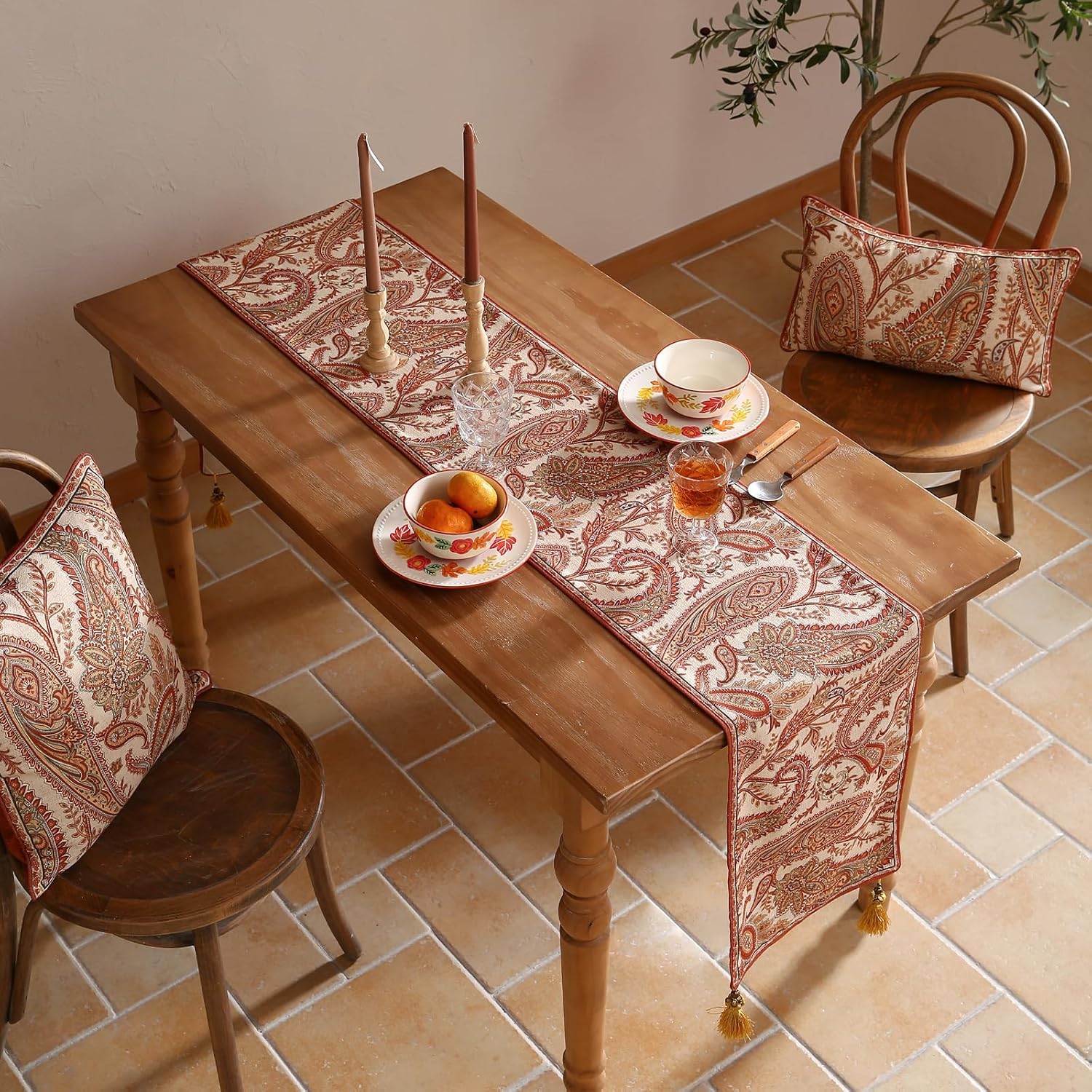 ISAENNE Designer Elegant Red Linen Extra Long Table Runner 118 Inches,Vintage Paisley Pattern Durable Table Runners for Dining Tables,Thanksgiving,Kitchen Tables,Christmas,12"*118"-Chauffrey A