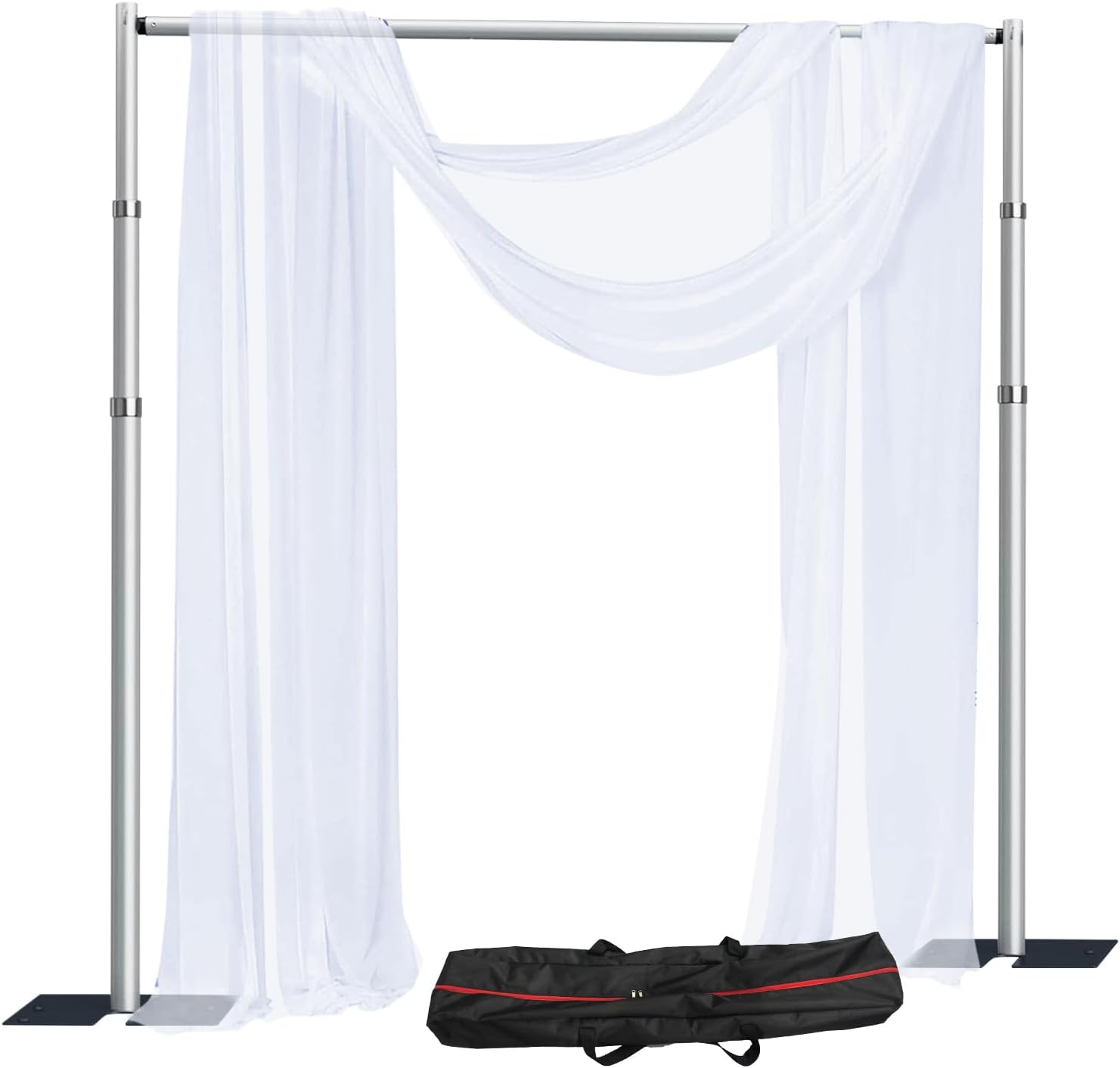 - The Kit included 2 x Heavy Metal Base, 2 x Support uprights, 1 x Adjustable Cross Bar, 2 x short straight pipes, 2 x Screw,1 x Wrench 1 x Carry bag. Pipe and drape backdrop kit is Aluminum Stand, Durable, easy to assemble and take down.