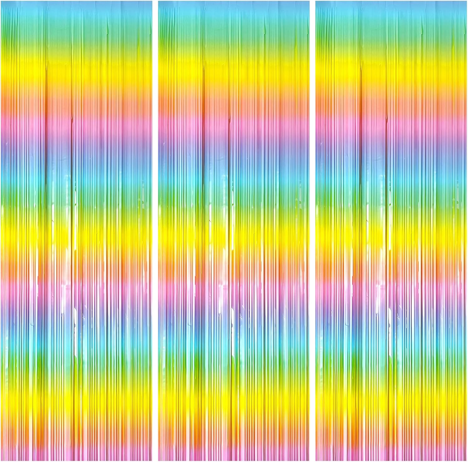 - Rainbow Birthday Decorations:3 packs rainbow streamers, the size of the foil curtain is 3.28 ft x 6.56 ft.It's long enough to fit any occasion. Please do not stick the foil curtain on uneven or stained walls to prevent it from falling off.