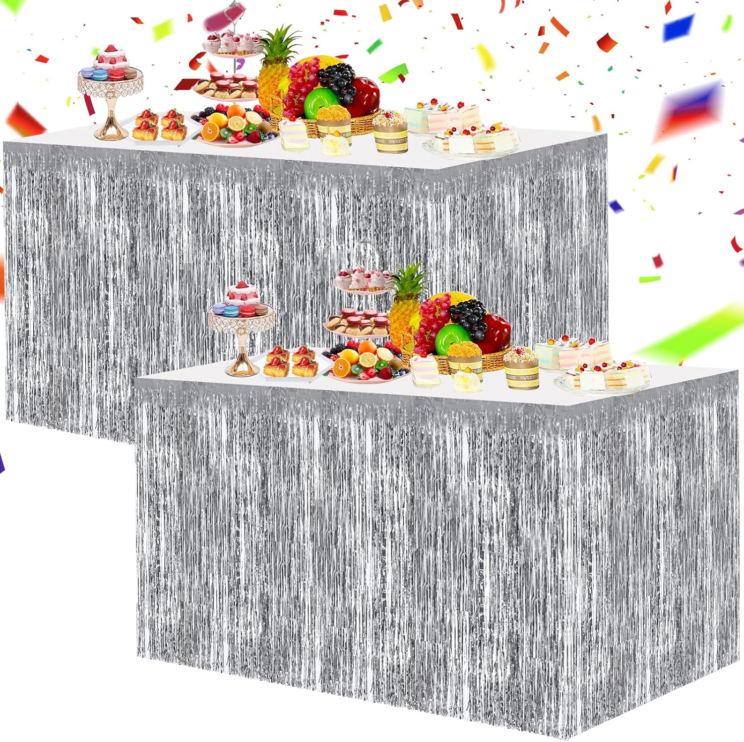 - 【Wildly use】Our tinsel foil fringe dessert table skirt is the lovely finishing touch for any themed party such as Engagement, Bridal Shower, Cartoon party and so on. They are also suitable for ceremonies, graduations, etc.