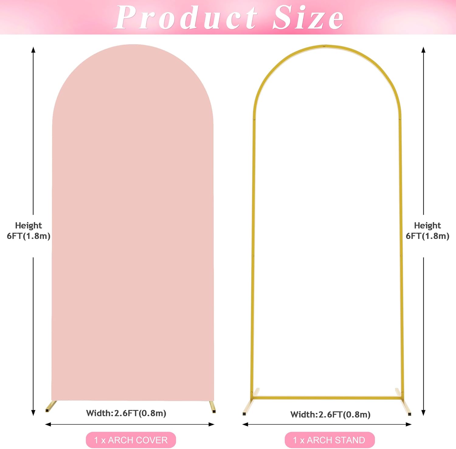 - 【Arch Stand and Covers Package】Package contains 1pcs wedding arch stand and 1pcs arch cover. Size: 6x2.6ft(HxW). Material: metal arch backdrop stand and spandex arch cover. Color: Pale Pink arch cover and gold wedding arch stand. Decorate your party with our gold arch stand and arch covers to create an epic decor for your celebration.