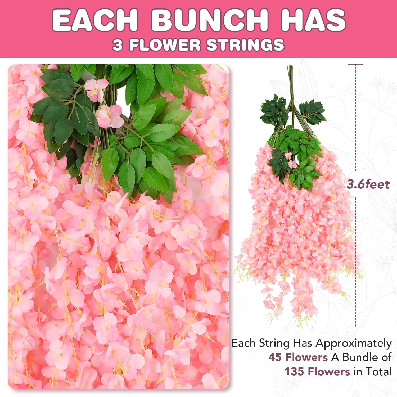 - Include Content:This package includes 25 pink artificial wisteria vines, measuring 3.6 feet in length. Each vine has three branches, measuring 23.6 inches in length. There are 29 pink wisteria flowers on each branch
