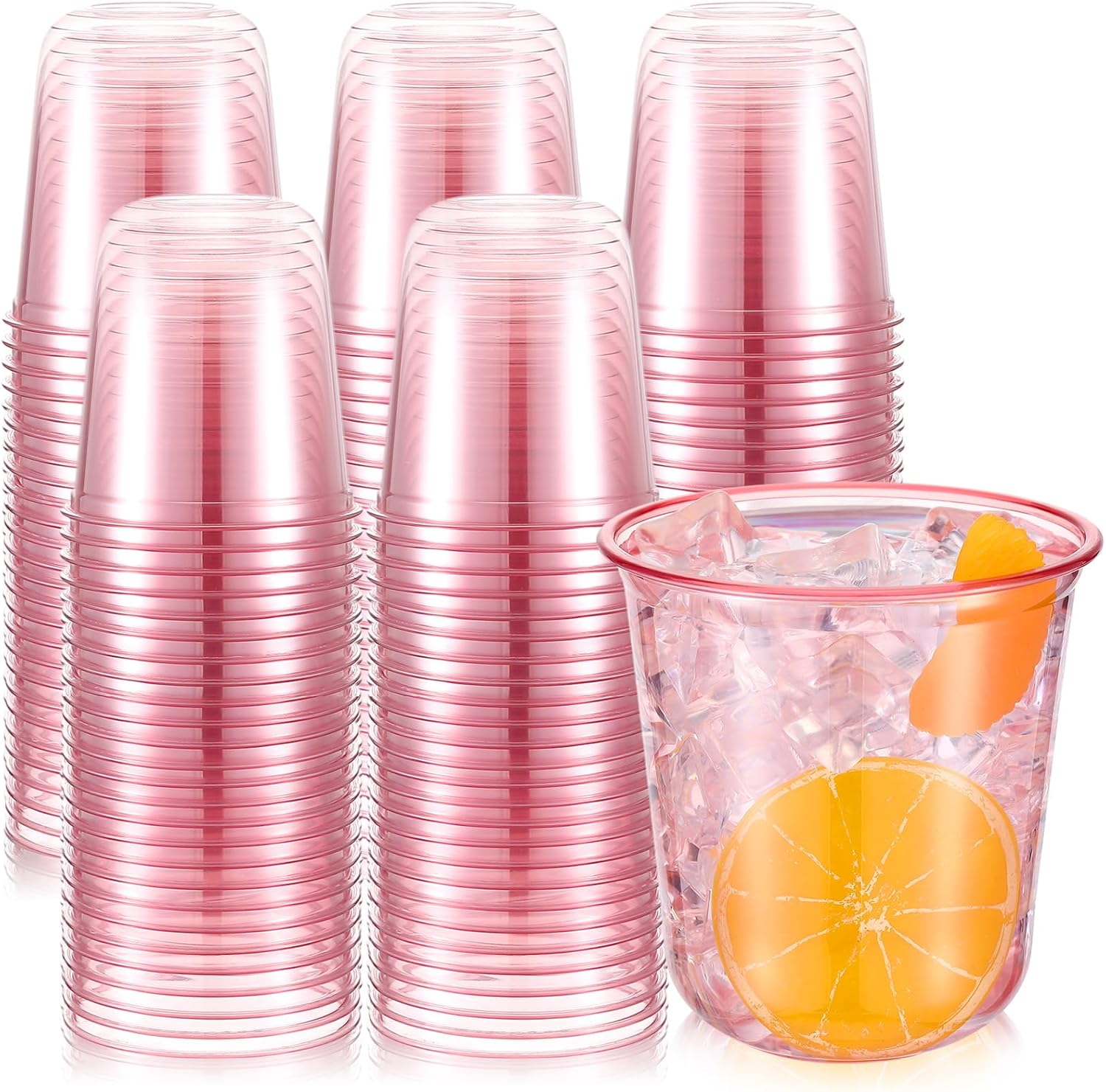 100 Pcs Disposable Stemless Glasses 12oz Crystal Plastic Wine Glasses Clear Classic Pet Cup for Meeting Weddings Birthdays Cocktail Christmas Party Supplies (Pink)