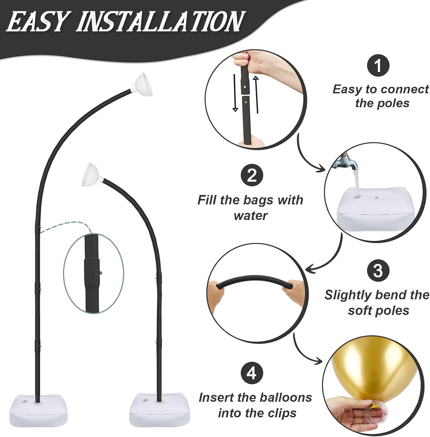 - 【Super Easy To Set Up】Our balloon arch kit comes with instructions that detail the process step by step. You just need to link each tube together and finally insert it into the base. Each water bag weighs 15 pounds after filling with water to make the arch balloon stand more stable. The top tube can be bent according to your needs which will perfectly make a half arch stand.