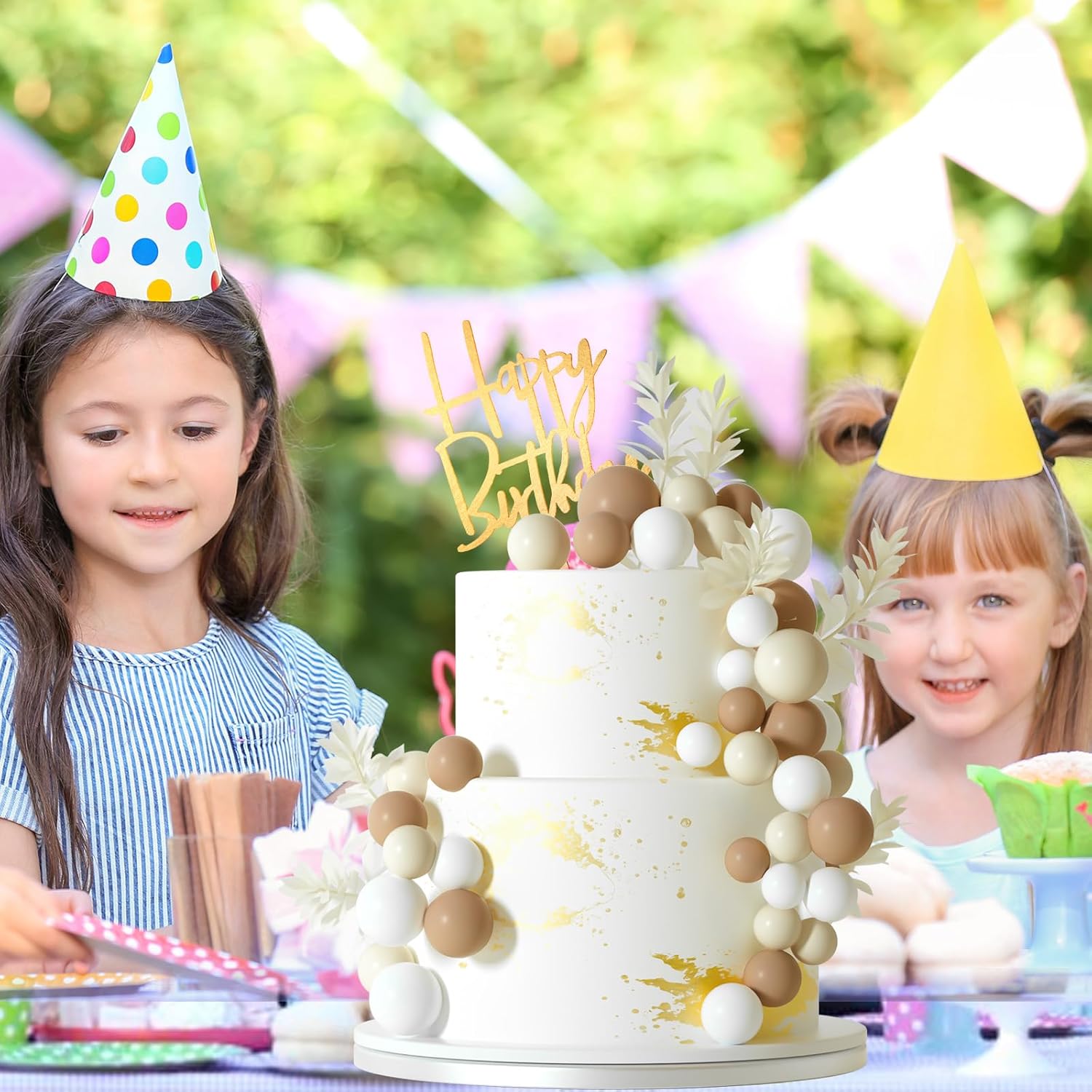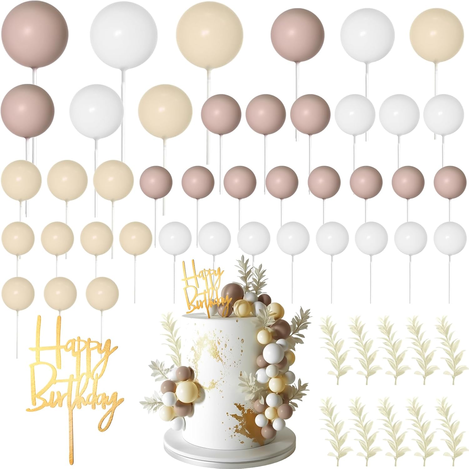 - Package included : 10pcs white grass cake toppers, 1pc happy birthday cake topper, 14pcs khaki balls, 14pcs ivory white balls, 14pcs white balls.