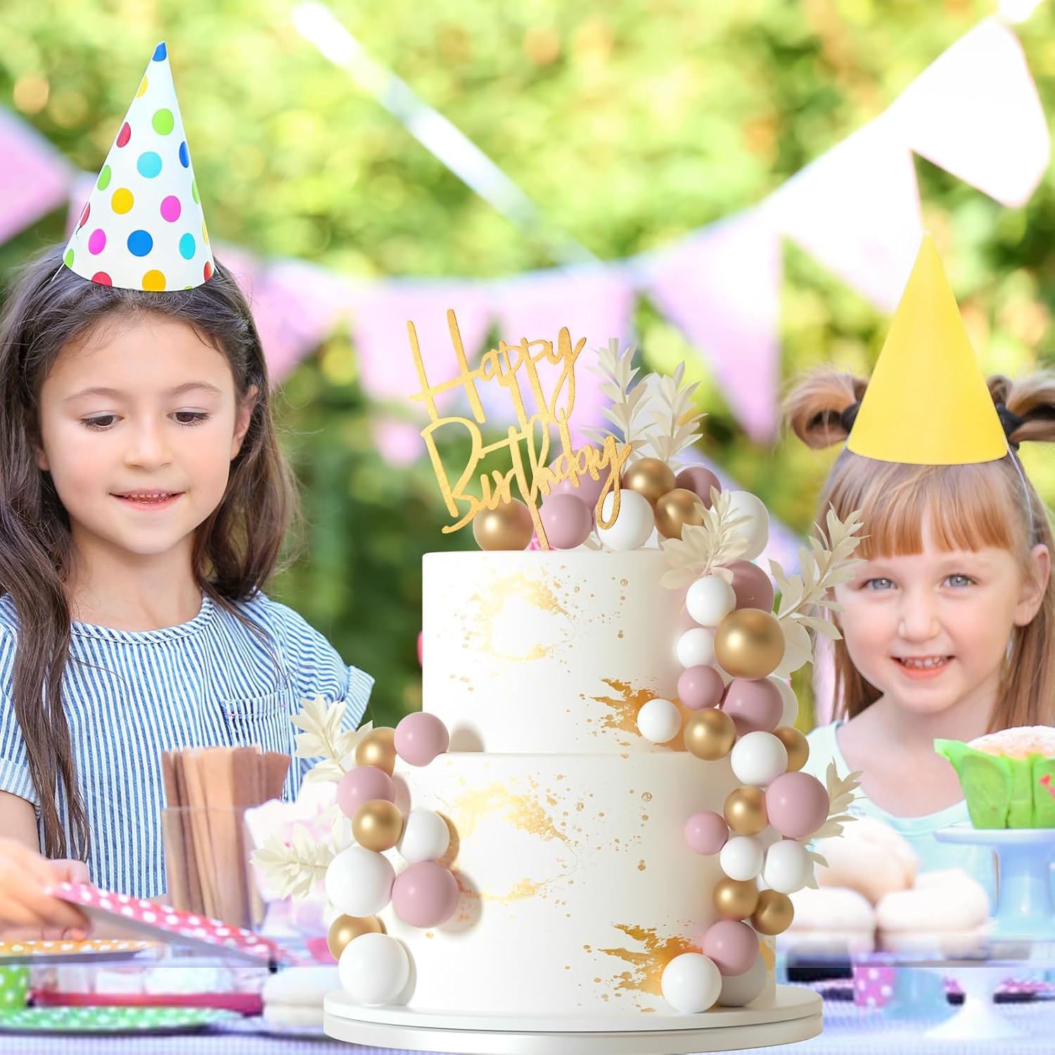 - Package included : 10pcs white grass cake toppers, 1pc happy birthday cake topper, 14pcs pink balls, 14pcs gold balls, 14pcs white balls.