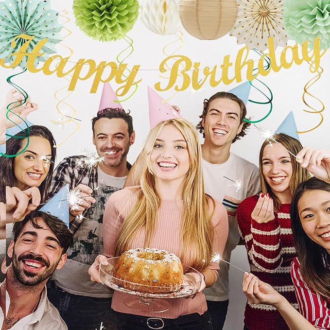 Sage Green Champagne-Gold Birthday Party-Decorations - 21pcs Happy Banner,Olive Retro Paper Lanterns Pom Poms,Rustic Boho Neutral Streamers Garland,Women Girls Boy Decor Supplies Huglony