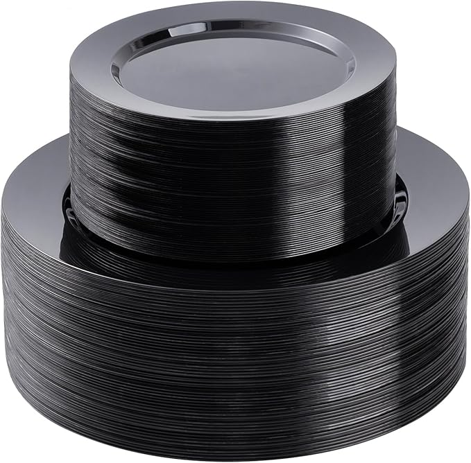 - EXQUISITE PARTY SUIT- Party plate sizes are suitable for all events. This black plastic dinnerware set includes 50 dinner plates (10.25 inch) and 50 smaller dessert plates (7.5 inch), perfect for generous main courses and delectable desserts, cakes, and appetizers.
