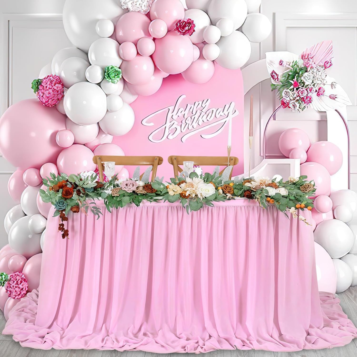 - ๐ก Pink Table Skirt Material: The extra long chiffon table skirt is made of Sheer Chiffon which is wrinkle-free, soft, and with a nice drapery. Table skirt both robust for kids birthday party supplies and elegant if used for wedding decoration.