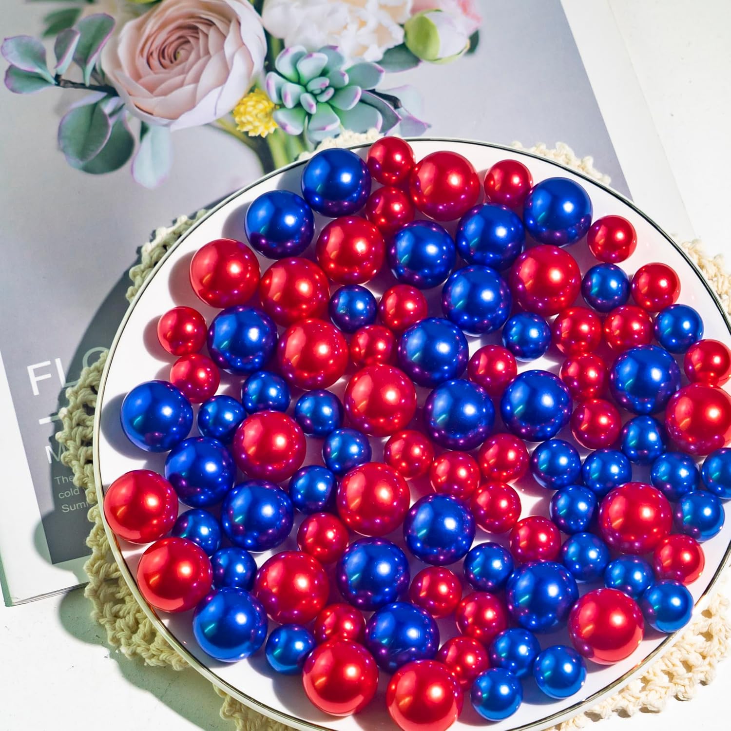150Pcs Blue&Red Polished No Hole Faux Pearl Beads for Vase Filling Decorations, Plastic Pearls Vase Fillers, Table Scatters, Wedding Centerpiece, 8/14/20 mm, 4th of July Independence Day Home Decor