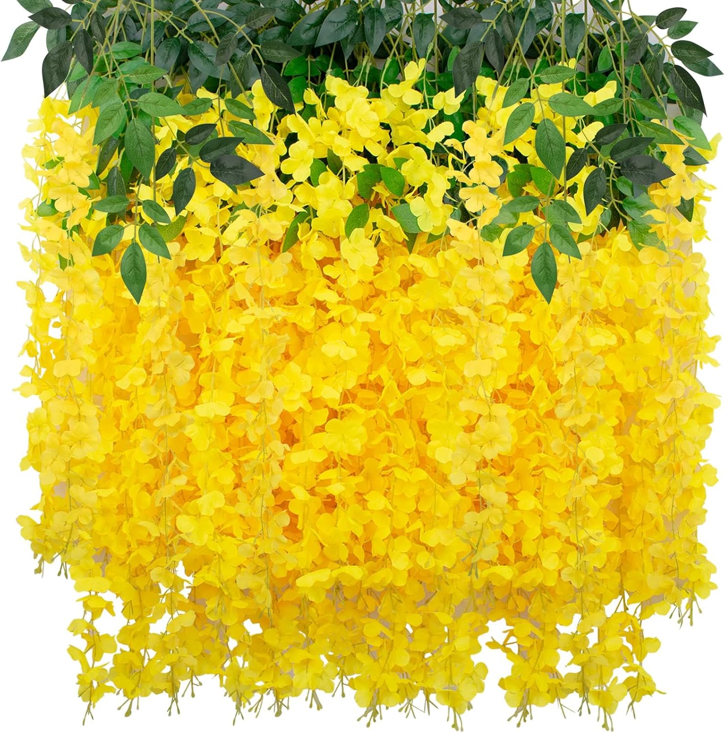 - 🌼Product Details - 12 pack artificial yellow hanging flowers, each wisteria flower vine is approximately 43.2"/3.6 ft in length, each wisteria has 3 branched flower strings, each string is 23.62" long with abundant flowers, looking full and beautiful.