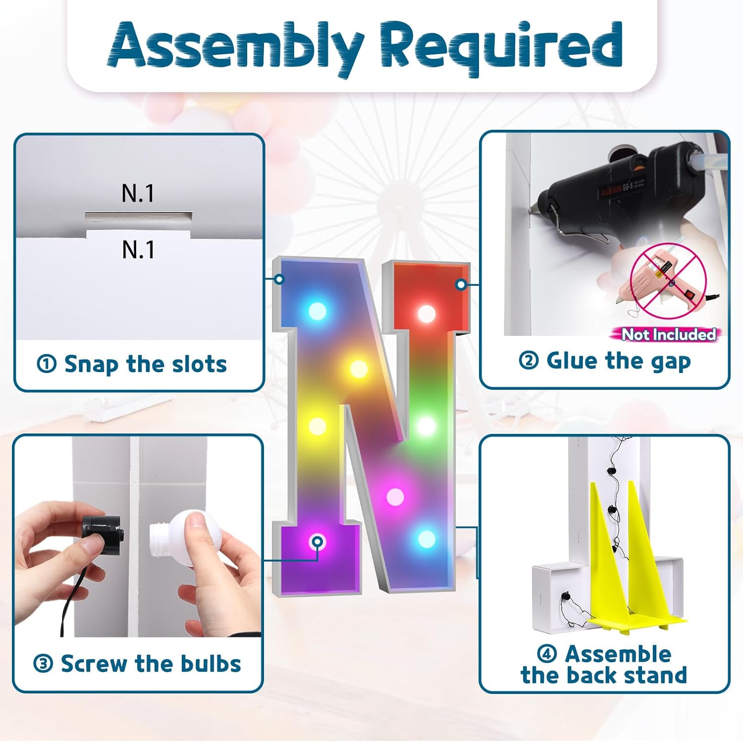 - Assembly Required. To assemble the light up numbers and letters, a hot glue gun is necessary. We have conveniently pre-cut the numbers into several pieces for your convenience. Simply consult the included instruction manual to easily assemble the impressive 4 ft tall and 3ft tall marquee numbers and letters using a hot glue gun.