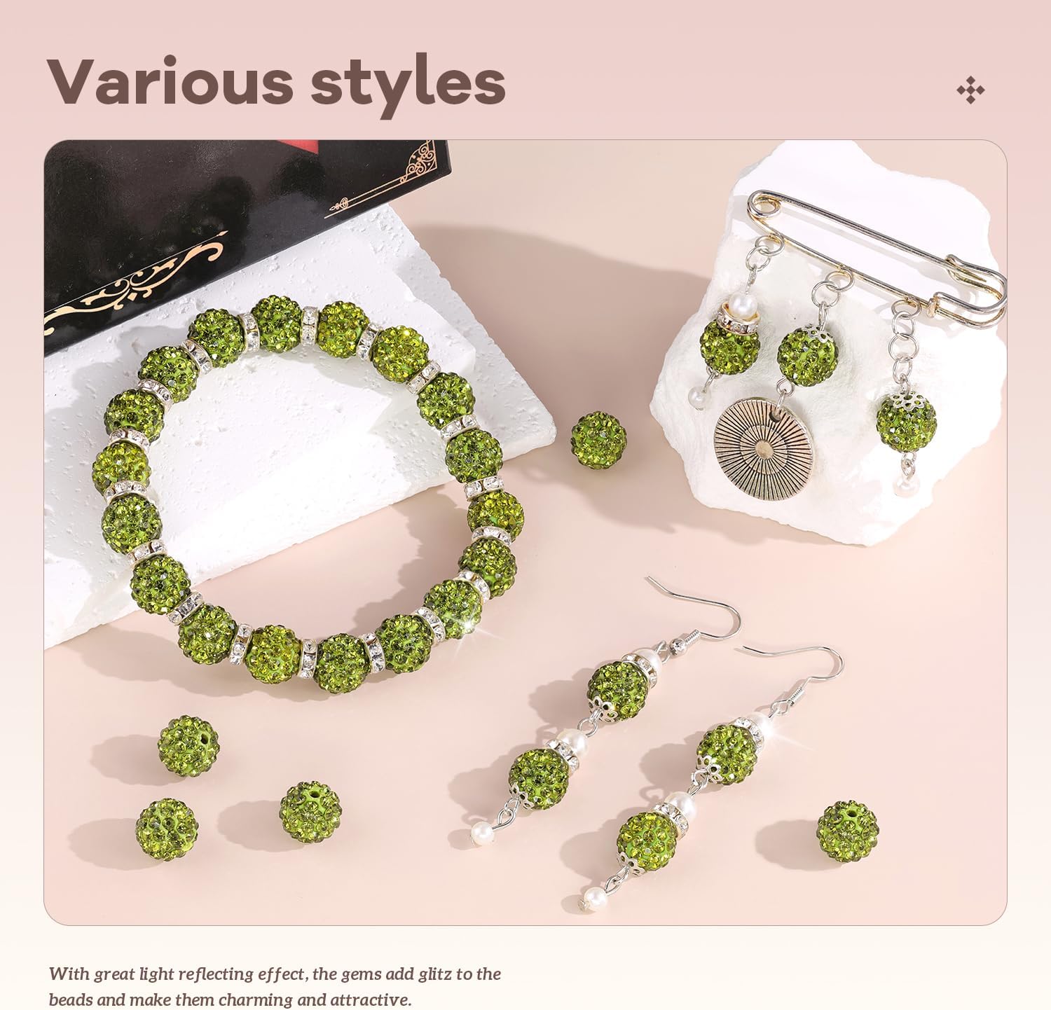 105pcs 10mm Rhinestone Beads for Jewelry Making, Olivine Shiny Round Disco Ball Beads Bulk, Sparkle Crystal Clay Christmas for Bracelet Baseball Necklace Earring Crafting and DIY