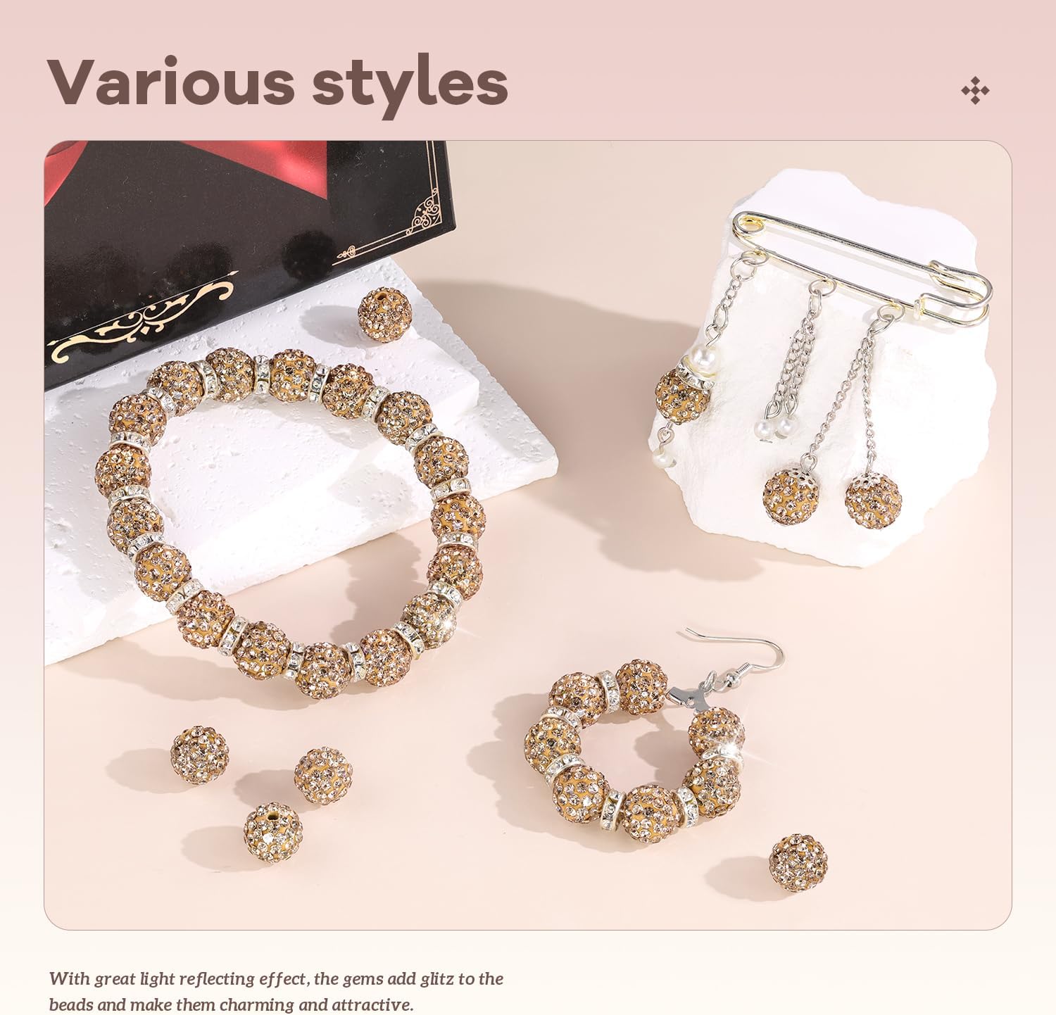 - BLING EFFECT -- Our rhinestone beads are made of polymer clay, embedded with superior quality glass rhinestones. We do quality control management to ensure the high quality of the bling beads. Rhinestones cover the entire surface and are not easy to fall off, shining like a diamond. With great light reflecting effect, the gems add glitz to the beads and make them charming and eye-catching. Wearing ornaments made from these beads, you will be the center of attention.