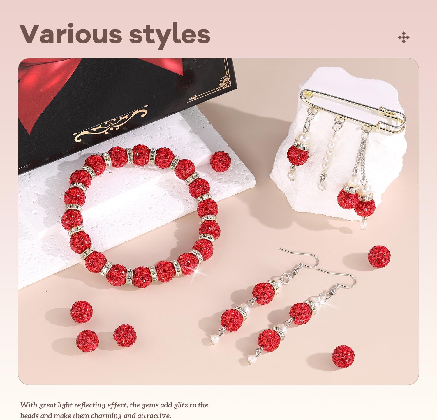 160pcs 10mm Rhinestone Beads for Jewelry Making, Red Shiny Round Disco Ball Beads Bulk, Sparkle Crystal Clay Christmas for Bracelet Baseball Necklace Earring Crafting and DIY