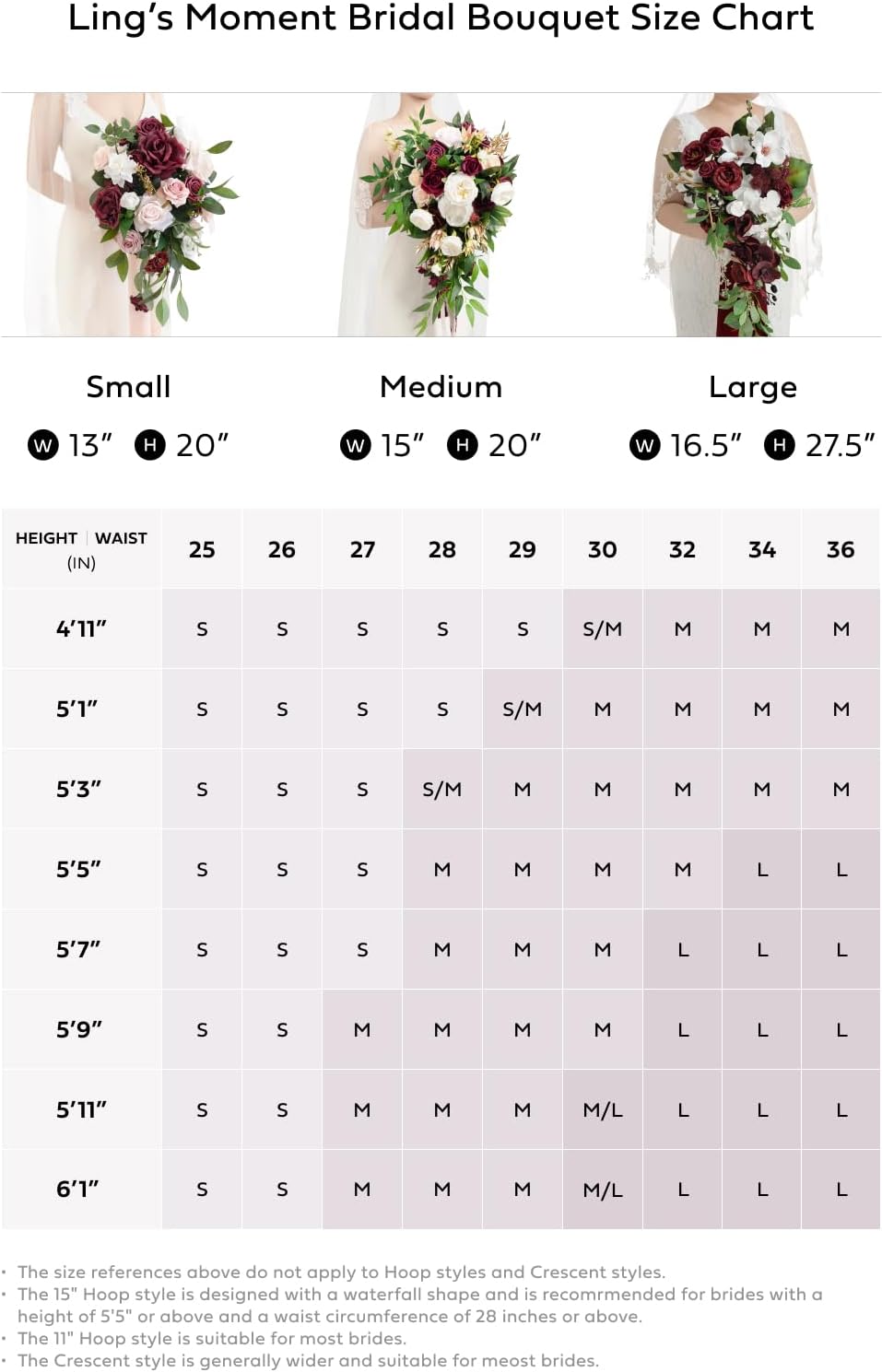 - Size: This Burgundy Wedding Bouquets for Bride is approx. [13 inches W x 20 inches H]. With ribbons card. This size is typically suitable for most brides to carry, this one is recommend for 4'11"-6'1"height and 25" waist, 4'11"-6'1"height and 26" waist, 4'11"-5'7"height and 27" waist, 4'11"-5'3"height and 28" waist, 4'11"-5'1"height and 29" waist, 4'11"height and 30" waist.