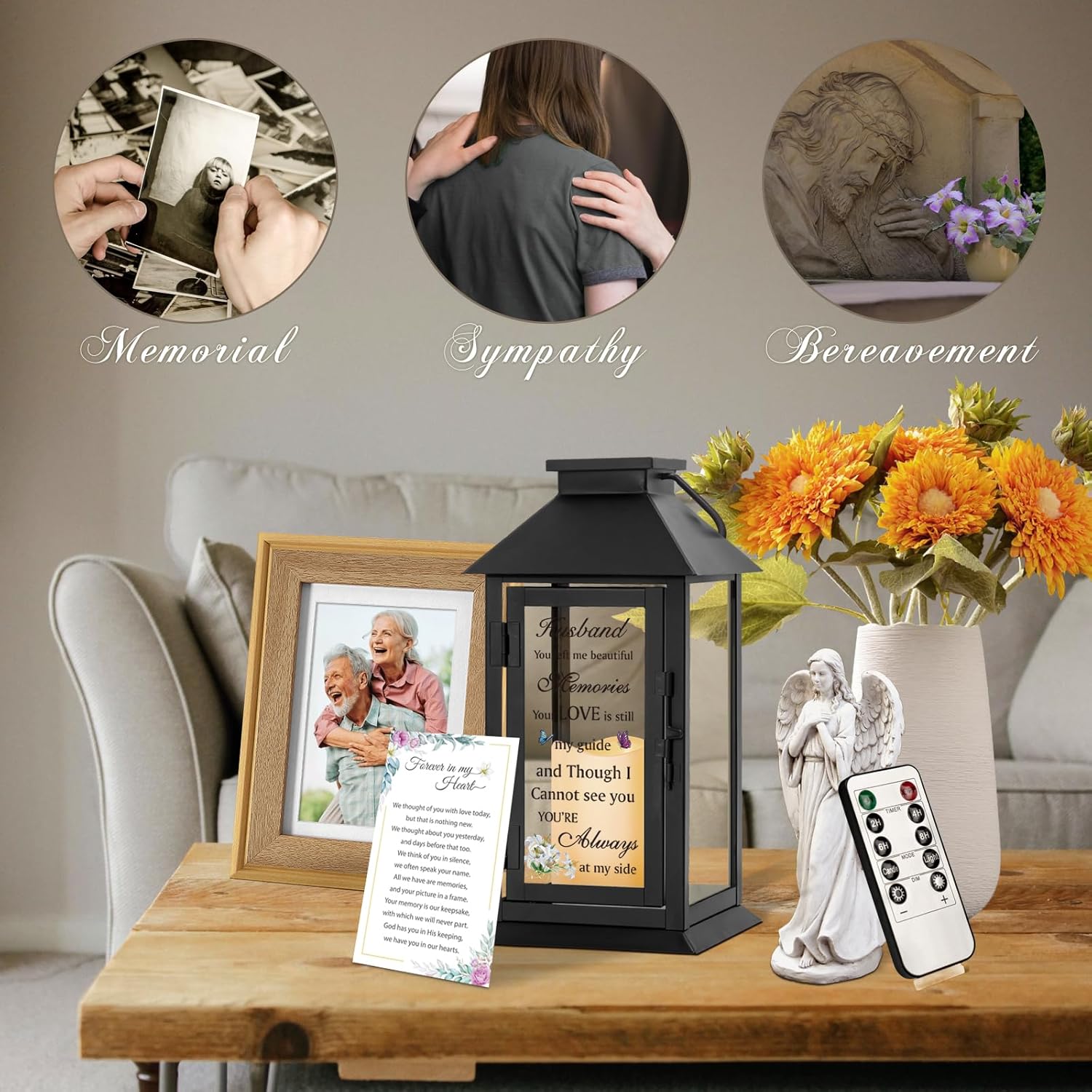 - Meaningful Gift: A unique way to treasure loved ones no longer with us. An attached handle on the top of this memorial lantern allows you to hang it or use it freestanding. The perfect sympathy gift for loss of husband.If you have any questions, please feel free to contact us and we will offer you a satisfactory solution in 24 hours.