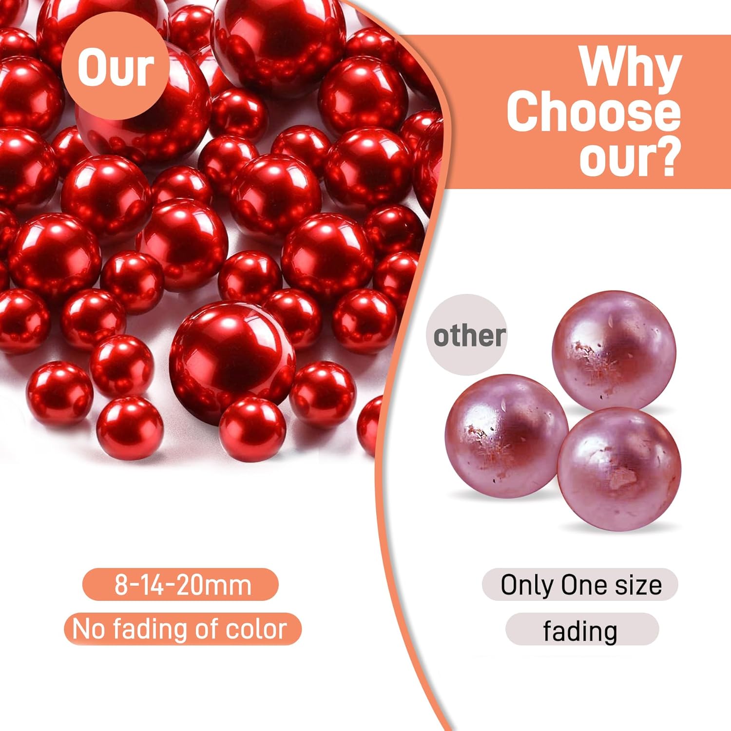 120 PCS 8/14/20mm No Hole Polish Pearl Beads for Centerpiece, Red Beads Decorative Vase Fillers, Plastics Pearls for Vases, Table Scatters, Wedding Party Decor